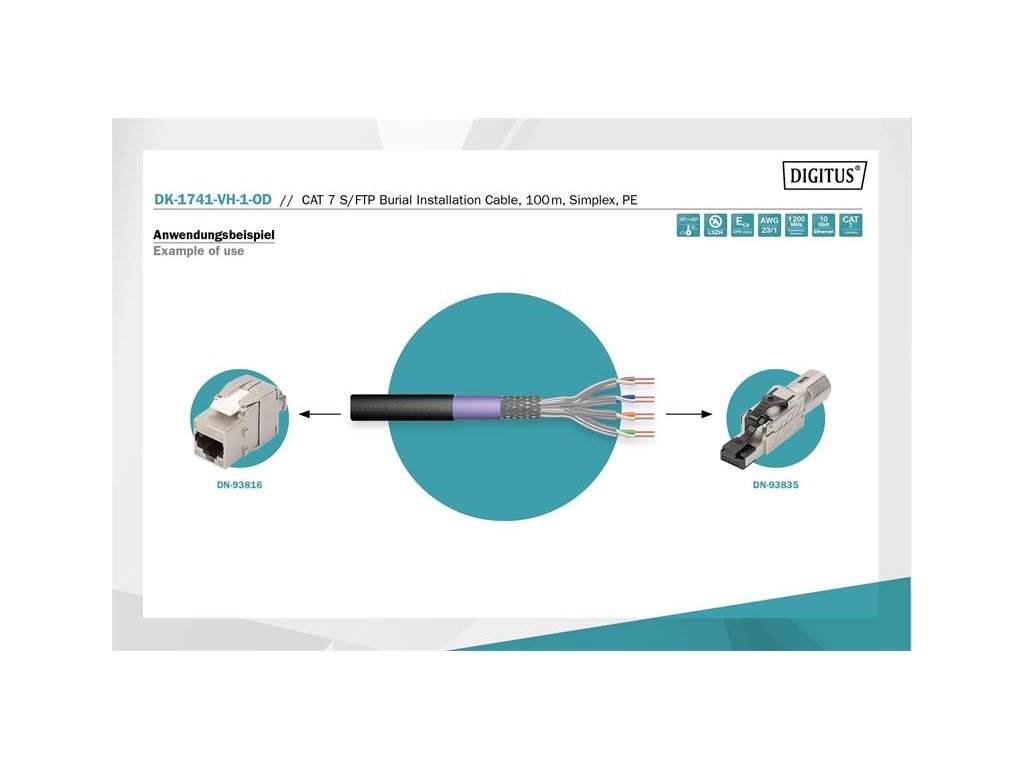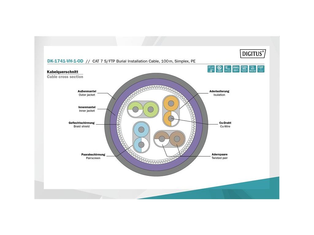 DIGITUS kábel Cat7 S/FTP, drôt, OUTDOOR, 1200MHz PE, Eca (LSZH), AWG 23/1, 100m, modrá/čierná DK-1741-VH-1-OD