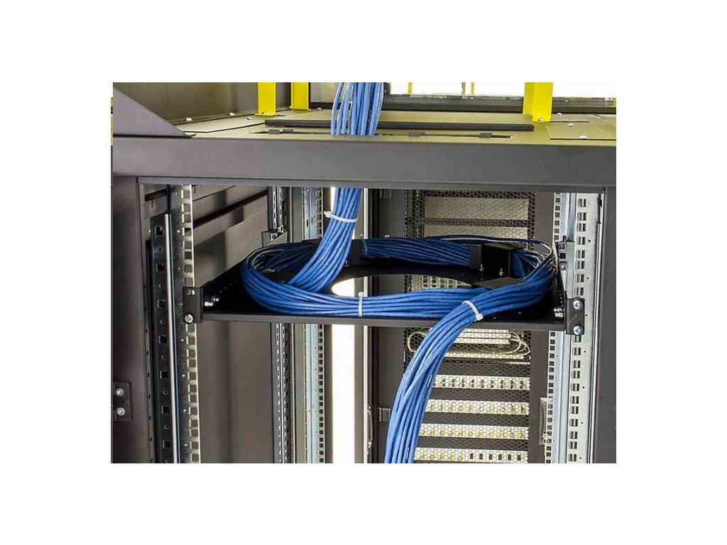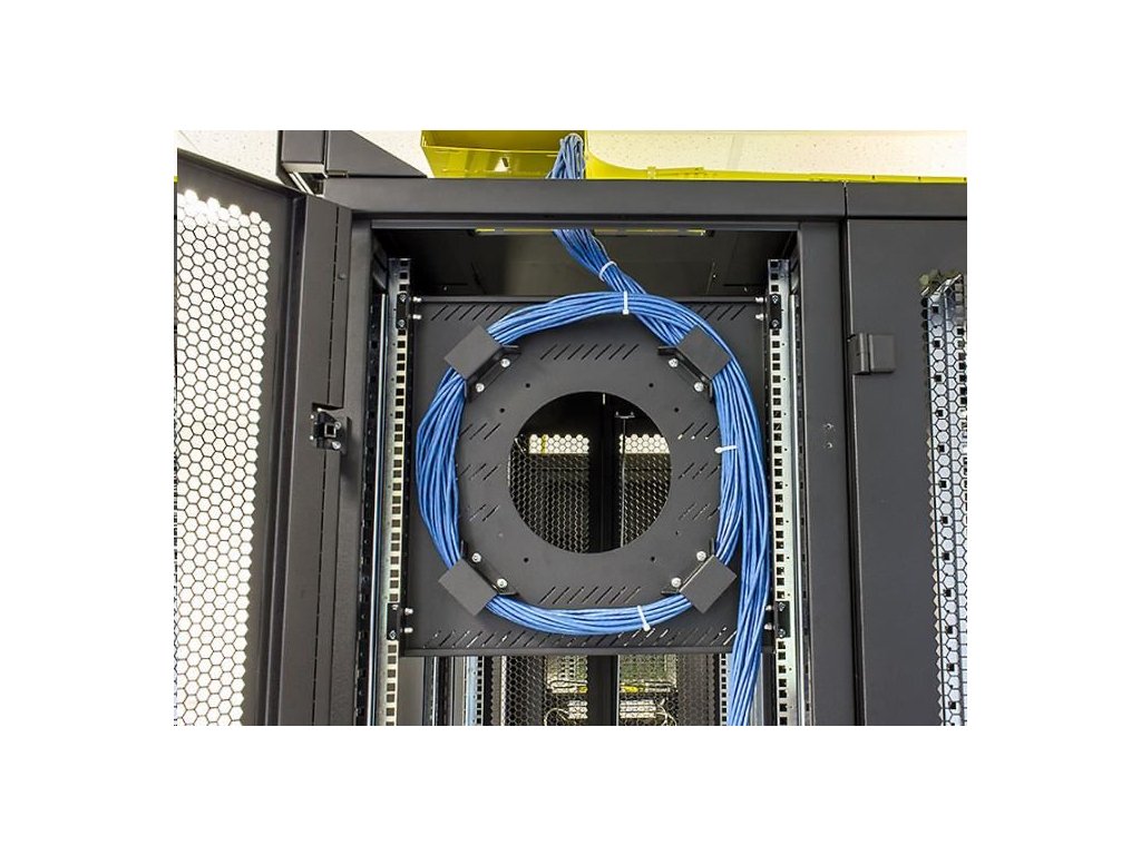držiak je možné inštalovať vertikálne (10U) na 19" vertikálne lišty (zvyčajne na zadnej strane racku) alebo otočením držiakov horizontálne medzi vertikály ako klasickú policu. Podporné hroty namontované okolo centrálneho otvoru zabezpečujú polomer ohybu uložených káblov a zabraňujú ich poškodeniu.