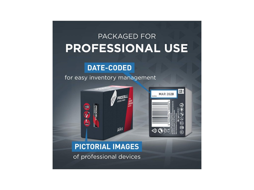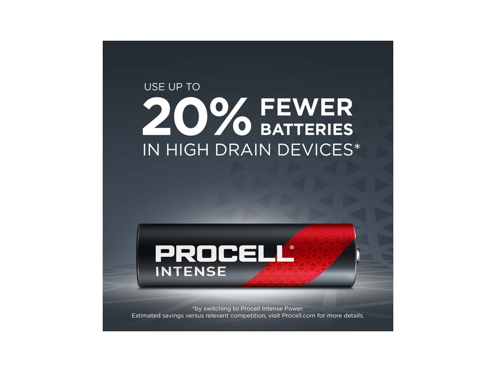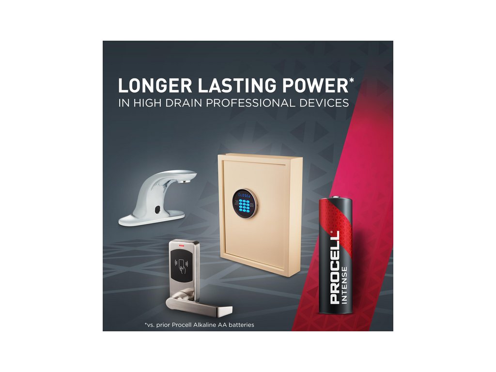 Priemyselné alkalické batérie Procell Alkaline Intense AA sú špeciálne navrhnuté pre dlhšiu výdrž (v porovnaní s predchádzajúcimi alkalickými batériami Procell AA) v profesionálnych zariadeniach s vysokým odberom energie, ktoré vyžadujú vysoký výkon alebo výkonové špičky. Sú ideálne pre zariadenia ako elektronické zámky dverí, bezdotykové dávkovače mydla alebo bezpečnostné kamery.