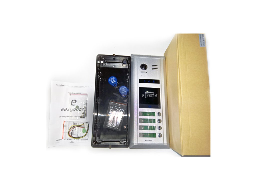 Dverná jednotka, video, 4 tlačidlá, antivandal, podsvietené menovky, indikácia stavu hovoru, povrchová úprava - hliník, biele LED prisvetlenie snímaného priestoru, farebná kamera, uhol záberu 105°, krytie IP 43, 12 V DC alebo NO/NC relé ovládanie pre 1 zámok, (možnosť pridať RLC modul pre 2. zámok), nastaviteľná dĺžka otvorenia 1–99 s, zabudovaná RFID čítačka kariet 125 kHz (kapacita 300 užívateľov, možnosť priradenia a editácie kľúčenky ku konkrétnemu bytu), možná záloha prístupových kariet a čipov, rozmery 124 x 308 x 65 mm, montáž pod omietku, inšt. krabica súčasťou, napájanie 24 V DC zo zbernice systému, dvojvodičový systém zapojenia - nepolarizovaný, odporúčaný netienený krútený pár, min. 2 x 1 mm
