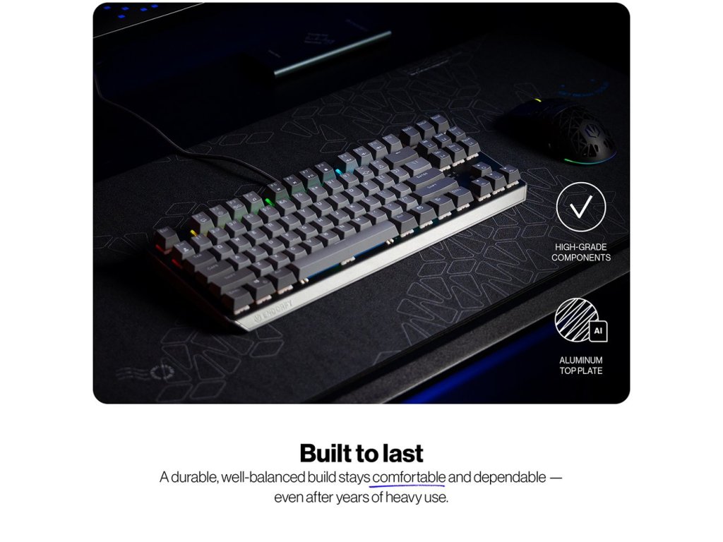 Klávesnice Endorfy Thock V2 TKL US je ideální volbou pro ty, kteří preferují rychlost, přesnost a styl. Tělo vyztužené horní hliníkovou deskou zvyšuje pevnost, stabilitu a je připraveno na pořádnou herní bitvu. Provedení s 3 vrstvami akustické pěny eliminuje vibrace a dutý zvuk. Díky tomu je každý stisk příjemný a klávesnice nezní jako nějaké staré železo.