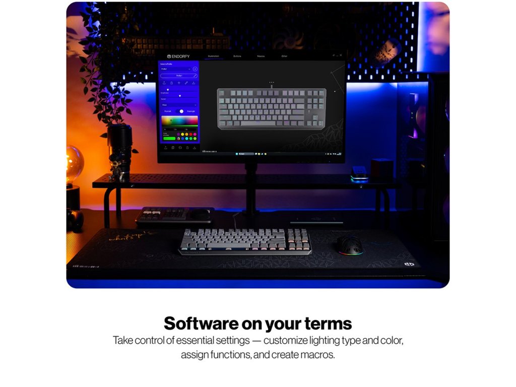 Spínače Endorfy Red jsou speciálně navrženy pro hladký stisk bez zadrhávání. RGB podsvícení je stylové na pohled a díky softwaru umožňuje také pokročilé nastavení. Vytvoříte si vlastní světelný „podpis“ a rozzáříte svůj herní kout. Klávesnice Endorfy Thock V2 TKL vám dá přesně to, co potřebujete pro dominanci na herní scéně.