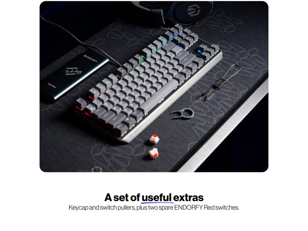V balení najdete nástroj na sejmutí kláves, nástroj pro výměnu spínačů, dva náhradní spínače Endorfy Red a odpojitelný USB-C kabel o délce 1,8 m pro flexibilní připojení.