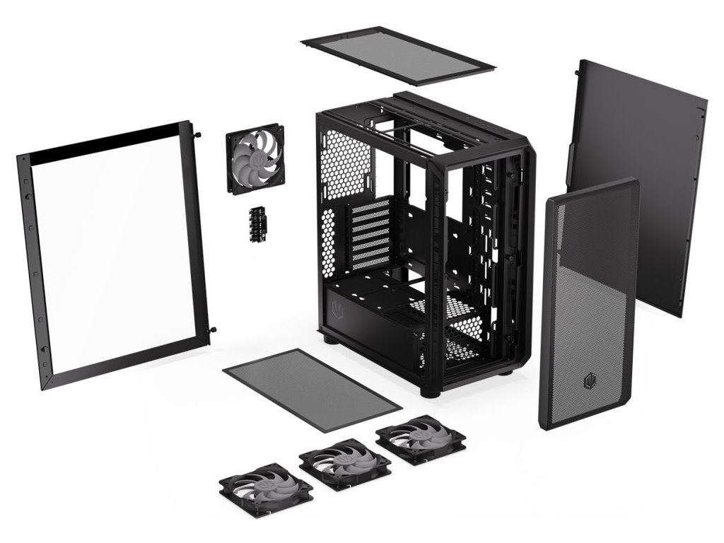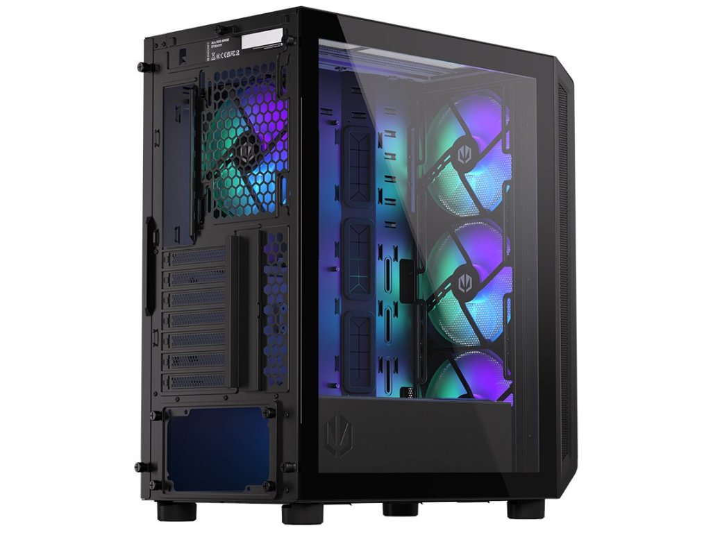 Endorfy Arx 500 ARGBSkříň formátu Middle Tower s průhlednou bočnicí nabízí šest 2,5" pozic pro SSD disky a jednu 3,5" pozici pro pevný disk. Na horním panelu naleznete dva porty USB 3.0, jeden port USB-C a dále také konektor pro sluchátka a konektor pro mikrofon. Skříň je osazena čtyřmi ventilátory o velikosti 140 mm s ARGB podsvícením. Důmyslné řešení umožňuje pohodlné umístění až 360 mm dlouhého výměníku vodního chlazení na přední straně. Ve skříni je dostatek prostoru pro chladič CPU do výšky až 179 mm a grafickou kartu o délce 350 mm. Skříň je dodávána bez zdroje. Součástí je také sada prachových filtrů.
