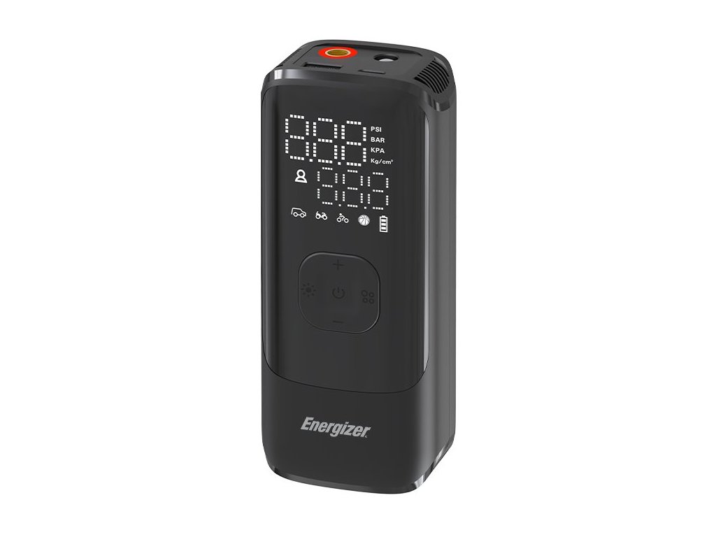 Energizer PAC4000Přenosný vzduchový kompresor a powerbanka s kapacitou 2000 mAh v jednom. Kompresor nabízí 5 provozních režimů (auto/kolo/motocykl/míč/vlastní), což zajišťuje snadnou obsluhu, která dokáže nafouknout pneumatiku na základě přednastavené hodnoty tlaku. Disponuje také třemi typy trysek, které dokonale fungují s tlakem až 150 PSI pro nafukování různých typů pneumatik. Digitální displej přehledně a rychle zobrazuje aktuální tlak, přednastavený tlak a volbu režimu. Potěší také LED svítilna, která je ideální pro vnitřní i venkovní osvětlení. Funkce automatického vypnutí automaticky zastaví huštění, jakmile tlak v pneumatice dosáhne nastavené hodnoty, aby se zabránilo přehuštění. Díky své kompaktnosti je vhodná na cesty.
