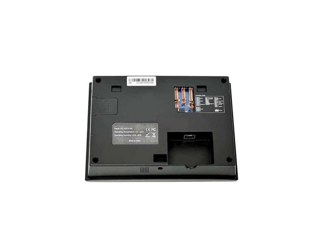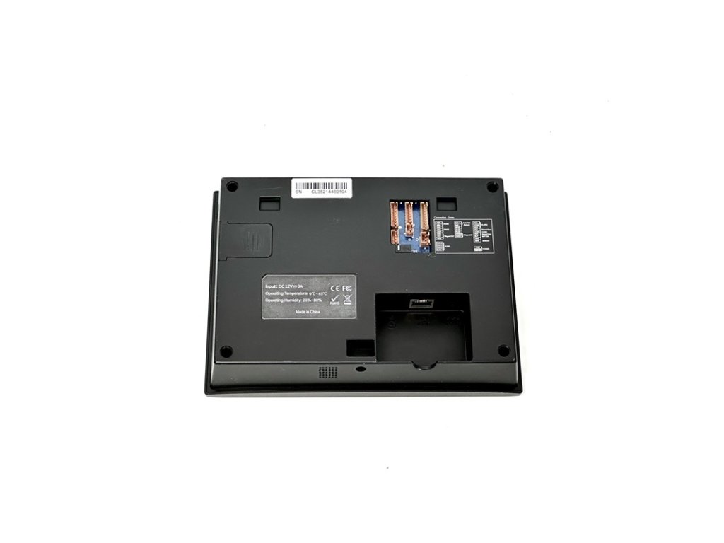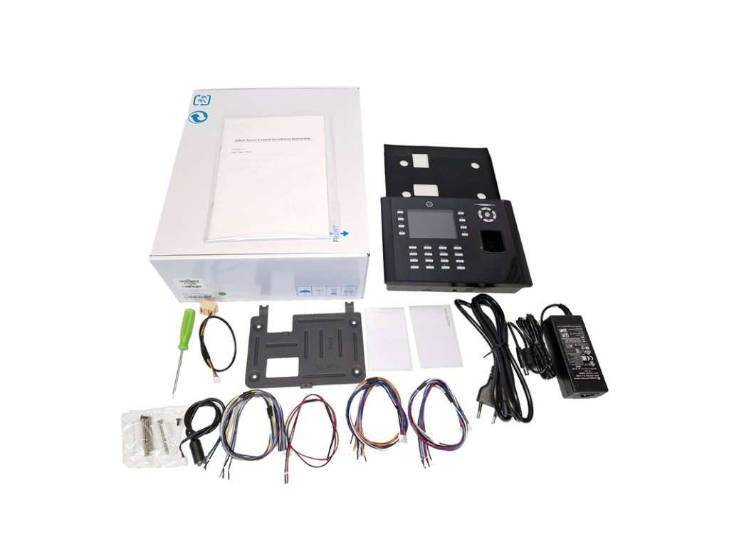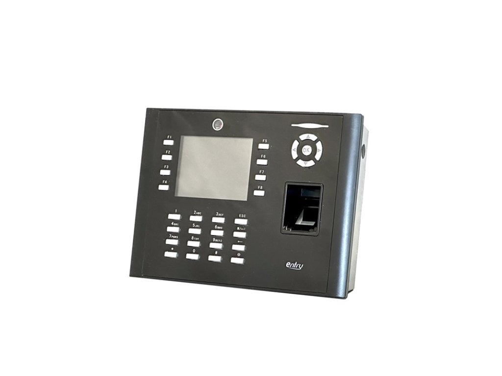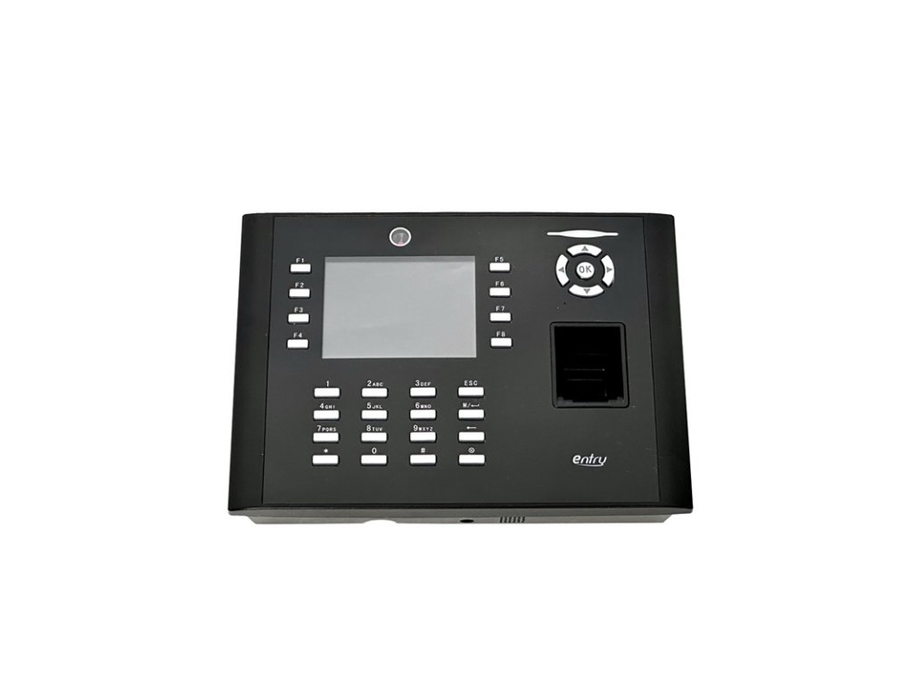 Dochádzkový terminál s biometrickým snímačom odtlačku prsta, bezdotykovou duálnou RFID čítačkou (štandard EM4100, 125 kHZ a Mifare 1K 13.56 MHz) a kódovou klávesnicou, kapacita 8.000 odtlačkov, 10.000 kariet, 200.000 udalostí, 3,5" farebný grafický TFT displej, SK / CZ / EN jazyk, zvuková a LED signalizácia, plnohodnotné spracovanie dochádzky, 8 programovateľných tlačidiel prerušení, zabudovaná kamera pre zosnímanie zamestnanca, komunikácia s PC cez TCP/IP alebo RS-485 alebo RS-232. Funkcie prístupového terminálu: 1x NO/NC relé zámku, 1x NC vstupné relé dverného senzora, 1x NO výstupné relé alarmu, 1x NO vstupné relé odchodového tlačidla, 1x Wiegand 26(34)bit vstup pre pripojenie externej RFID čítačky, 1x Wiegand 26(34)bit výstup pre pripojenie dochádzkového terminálu do Entry prístupového kontroléra, USB port pre prenos údajov a zmenu obrázka pozadia displeja, napájanie 12 V DC / 1500 mA (zdroj je súčasťou), rozmery 206 x 150 x 42 mm, interiérové použitie, zariadenie je kompatibilné so softvérom EDO3