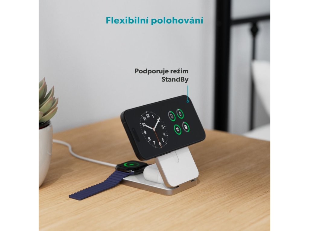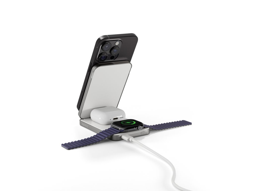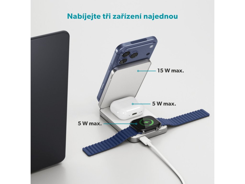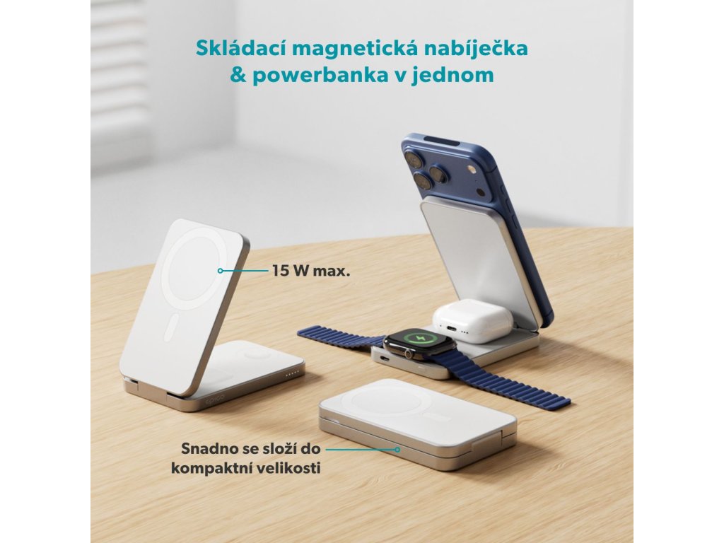 Bezdrátový nabíjecí stojánek a powerbanka v jednom Epico UltraBase EF50 je bezdrátový nabíjecí stojánek a powerbanka v jednom. Je kompatibilní s bezdrátovým nabíjením MagSafe s výkonem až 15 W (7,5 W pro iPhone) a díky silnému magnetickému uchycení udrží telefon vždy přesně na svém místě. Unikátní design 4v1 kombinuje univerzálnost nabíjecí stanice 3v1 s pohodlím powerbanky – ideální pro každodenní použití i na cesty. Kompaktní skládací provedení se snadno promění ve stojánek s flexibilní možností umístění telefonu na výšku i na šířku v režimu StandBy. Telefon lze nabíjet také ve složeném stavu. Bleskově rychlé nabíjení pro Apple Watch Nabíjejte svůj iPhone, Apple Watch, AirPods (či jiná sluchátka s bezdrátovým nabíjením) a další zařízení přes USB-C – všechny čtyři výstupy lze používat současně s celkovým výkonem až 12 W. Na rozdíl od standardních 2,5W nabíječek umožňuje až 5W výstup pro rychlé nabíjení vašich Apple Watch Ultra a Series 6 nebo novějších modelů. Kapacita 8 000 mAh poskytuje dostatek energie po celý den a 20W USB-C vstup i výstup zajišťuje rychlé a efektivní nabíjení vašich zařízení i dobíjení samotné powerbanky. Prémiové hliníkové tělo chrání před přehříváním, zatímco LED indikátor vám umožní mít stav baterie vždy pod kontrolou. Součástí balení je také praktický 0,3m USB-C na USB-C kabel.Dodatočné parametre