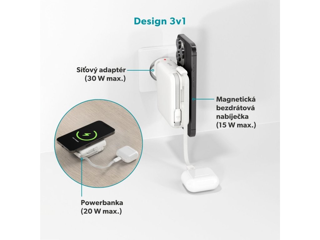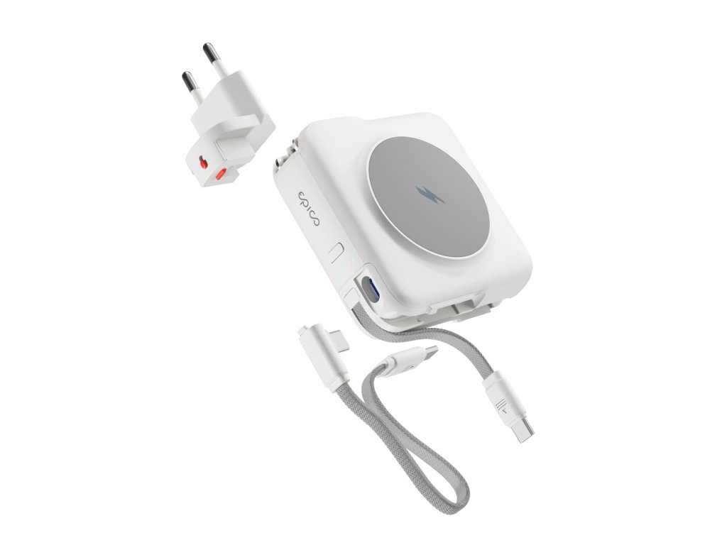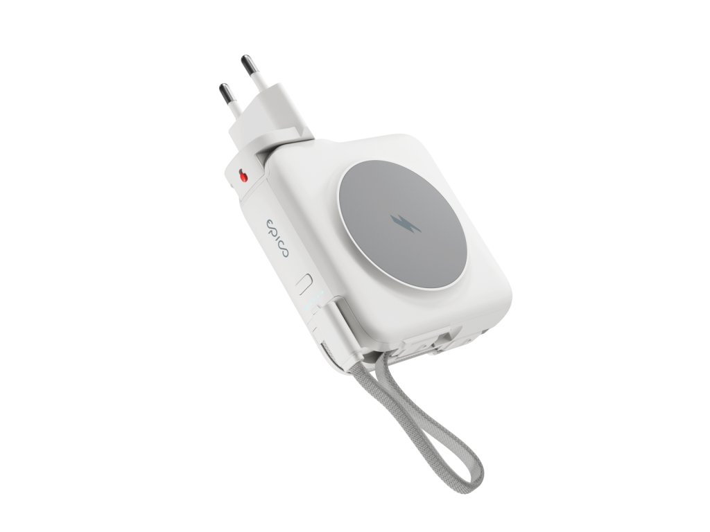 Powerbanka, nabíječka a adaptér v jednom Epico UltraPack 3in1 ET50 představuje praktické řešení pro každodenní nabíjení i cestování. Spojuje powerbanku, bezdrátovou nabíječku a síťový adaptér do jediného kompaktního zařízení. S kapacitou 10 000 mAh zajistí dostatek energie na celý den, ať už jste kdekoliv. Díky podpoře Qi2 a MagSafe můžete snadno nabíjet pomocí magnetického bezdrátového nabíjení – až 15 W pro kompatibilní zařízení a 7,5 W pro iPhone. Univerzální řešení na cesty Vestavěná US zástrčka spolu s přiloženými adaptéry pro EU, UK a AU zajistí kompatibilitu prakticky kdekoliv na světě bez nutnosti přenášet více různých nabíječek. Při zapojení do sítě poskytuje výkon až 30 W přes USB-C a v režimu powerbanky umožňuje kabelové nabíjení výkonem až 20 W. Součástí balení jsou dva opletené USB-C kabely – vestavěný a odnímatelný oba podporující rychlé nabíjení až 60 W. Přehledný LED indikátor navíc zobrazuje aktuální kapacitu baterie.Dodatočné parametre
