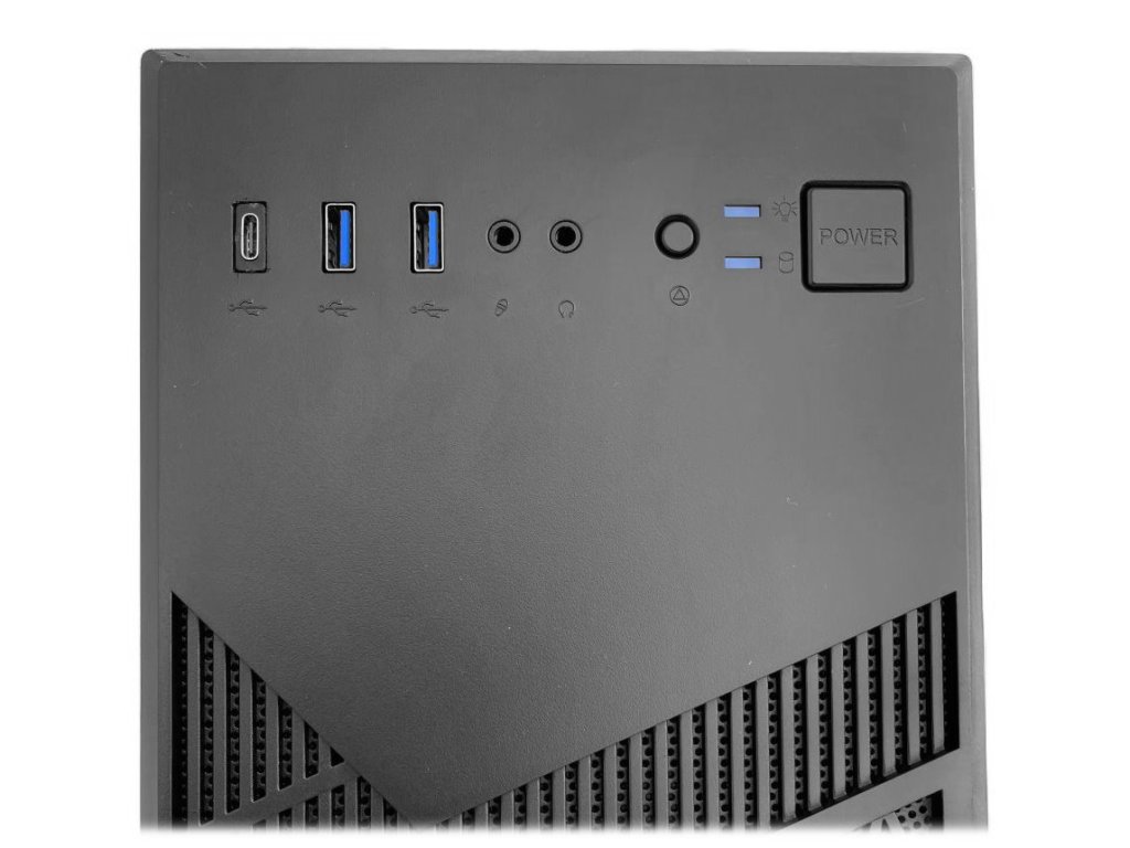 Konektory na předním panelu: 2× USB 3.0, 1× USB-C, 1× sluchátkový výstup, 1× vstup pro mikrofon