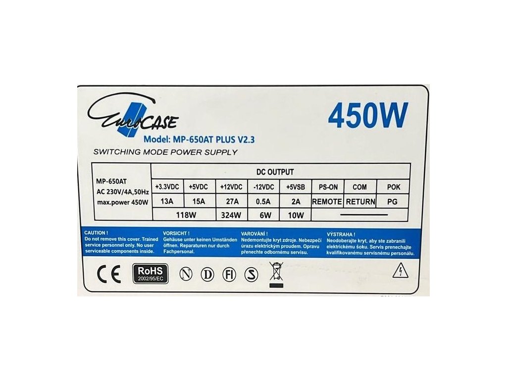 Napájací zdroj ATX značky Eurocase s výkonom 450W. Je osadený 120mm ventilátorom a pasívnym PFC (Power factor correction). Otáčky ventilátora sú riadené termoreguláciou. Zdroj spĺňa požiadavky na elektrickú bezpečnosť a elektromagnetickú kompatibilitu. Zdroj vyhovuje aj smernici 2005/32/EU = príkon v pohotovostnom režime.