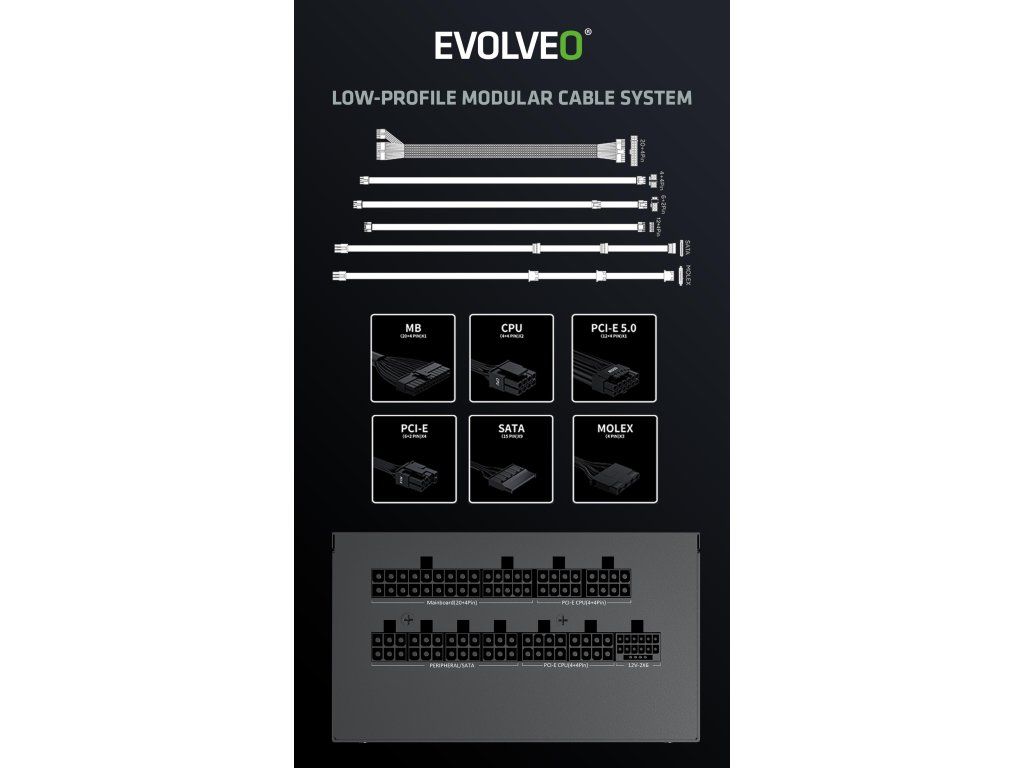 Zapomeňte na zamotané kabely, které brání proudění vzduchu a ještě vaší počítačové skříni kazí styl. Zdroj EVOLVEO G650-BK je plně modulární, takže k němu připojíte jen ty kabely, které opravdu potřebujete. Součástí balení jsou všechny důležité šňůry – jeden kabel ATX 24 PIN, dva EPS 4+4 PIN, dva PCI-E 6+2 PIN, jeden PCI-E 5.1 12V-2×6, tři SATA a jeden MOLEX. Díky tomu máte místo na vše od CPU a GPU přes disky až po vymazlené LED pásky či jiné extra prvky.Vstupní napětí zdroje činí 100–240 V. Součástí zařízení je přitom i 230V vstup na síťový kabel (tento kabel je součástí dodávky).Cool faktor vaší sestavy