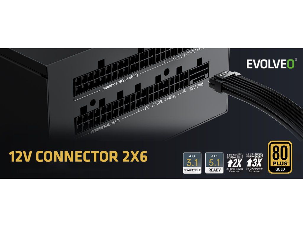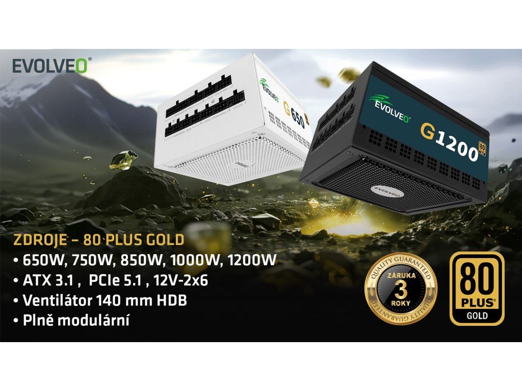 Rozjeďte na svém počítači aktuální herní hit nebo spusťte render náročného videa a pociťte ten masivní příval energie na vlastní kůži. Umožní vám to EVOLVEO G650-BK – herní PC zdroj, s nímž má váš počítač dostatek síly na všechny výzvy dnešního digitálního světa. Tento plně modulární 650W zdroj třídy 80 PLUS Gold je vyvedený v moderním formátu ATX 3.1 a podporuje i standard PCIe 5.1, takže s ním běží jako po másle i náročné grafické karty nové generace. Jeho pořízením si zkrátka zajistíte bezpečné, stabilní a efektivní napájení, které vaše herní doupě napumpuje energií, již si zaslouží. O spolehlivosti tohoto zdroje nemůže být pochyb – svědčí o tom i jeho prodloužená záruka (3 roky).Zlatá standardizace a japonská preciznost