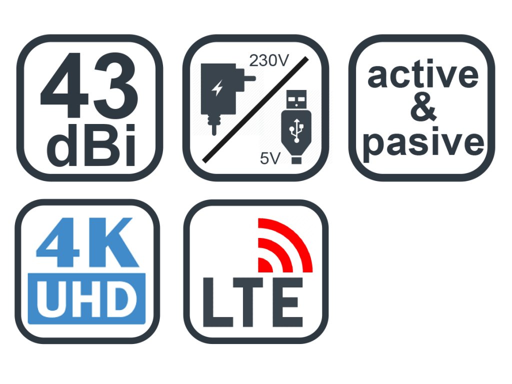 • Aktivní pokojová anténa • Pro příjem FM/DAB+/DVB-T2 • Zesilovač, zisk 43 dBi , filtr LTE, 4G, 5G • Napájecí adaptér, konektor IEC male