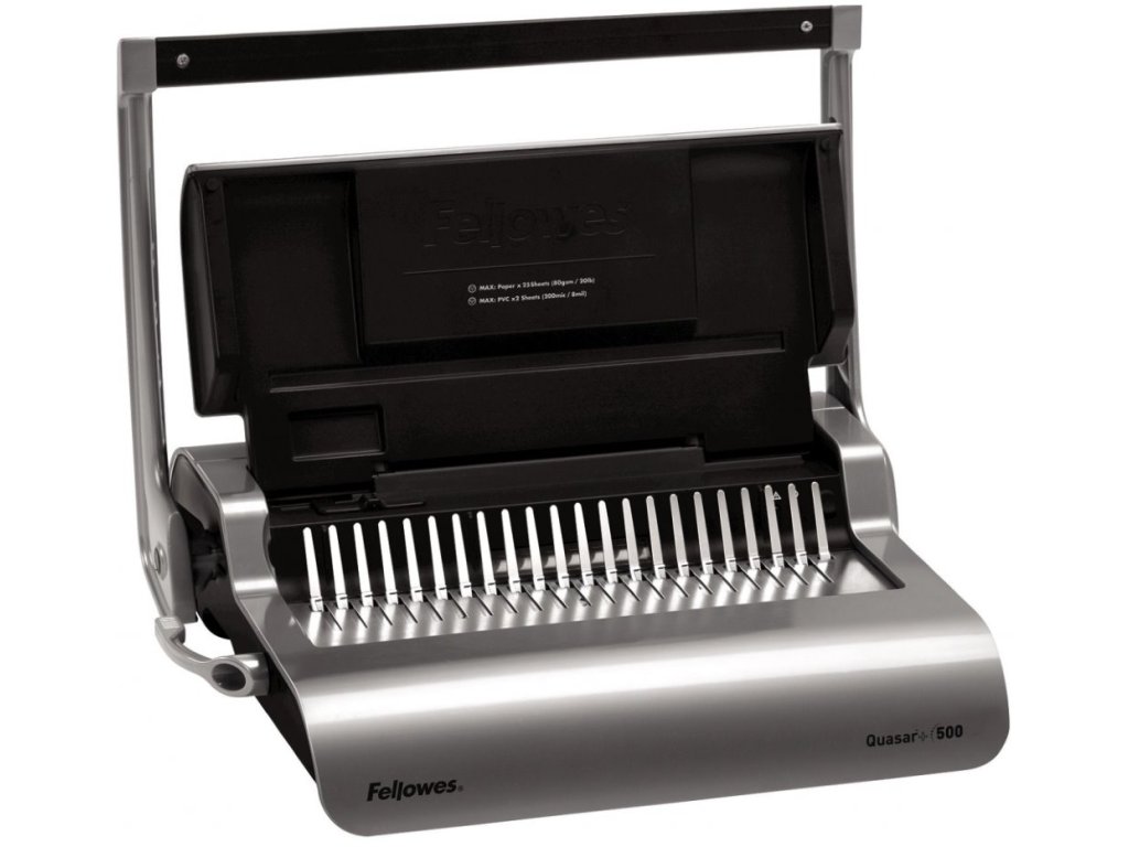 Fellowes Quasar+ 500Vázací stroj pro děrování až 25 listů najednou. Vkládání děrovaných listů shora zajišťuje bezchybnou perforaci. Oddělená děrovací a vázací páka pro průběžné vkládání děrovaných listů do plastového hřbetu výrazně zefektivňuje práci. Stroj je vybaven zásobníkem na uložení hřbetů a integrovanou měrkou pro správnou volbu průměru.