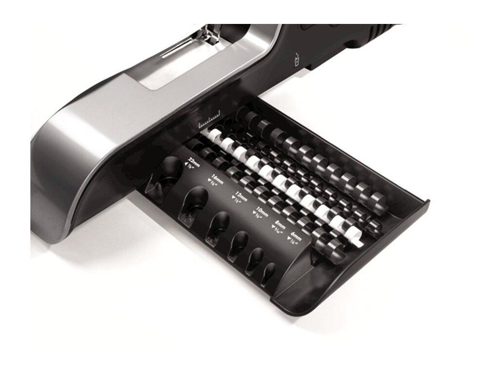 Výbava: zásuvka pro uložení hřbetů, měrka výběru hřbetu, základní sada
