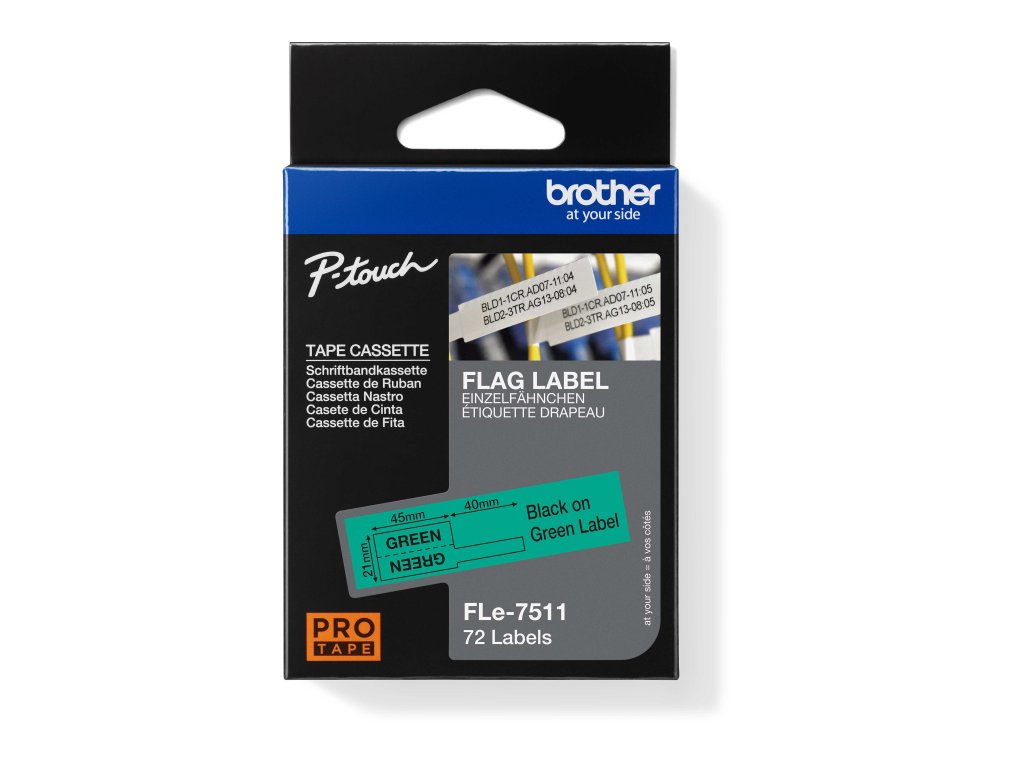 Tato kazeta s páskem FLe-7511 je vyvinuta pro snadné značení kabelů a vláken. *Černý text na zeleném předřezaném štítku *45 mm x 21 mm při tisku, 45 mm x 10,5 mm při nalepení *72 štítků na jedné pásce *Vysoce kvalitní originální štítky Brother *Jasné a trvanlivé výsledky Páska je vyvinuta pro snadné značení elektro, síťových a jiných kabelů, optických vláken,.. Jedná se o černý text na zeleném podkladu. Páska obsahuje 72 štítků s rozměry 45 mm x 21 mm (po nalepení jsou rozměry 45 mm x 10,5 mm). Tato popisovací černo-zelená páska FLe-7511 je ideální jak pro identifikaci kabelů tak pro univerzální použití. Jednoduše vytiskněte text nebo čárový kód na dvě části předřezaného štítku. Připevněte proužek štítku kolem kabelu, poté vezměte vytištěný předřezaný štítek a jednu polovinu přilepte na proužek štítku a poté jej přeložte přes druhou polovinu.Dodatočné parametre