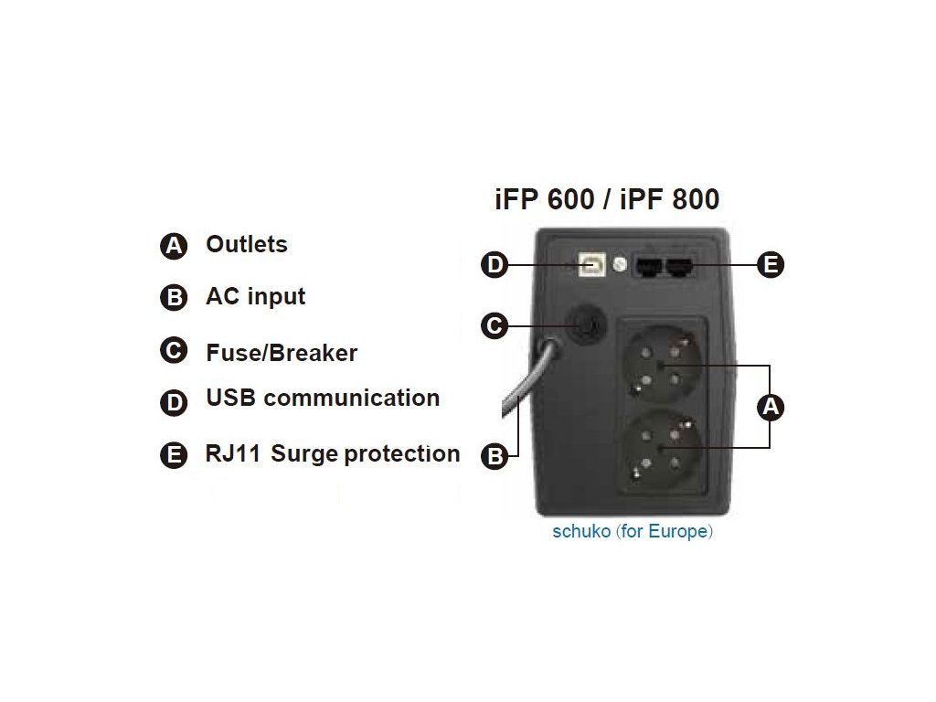 UPS zdroj slouží jako záložní baterie, která udrží počítače, servery a jinou IT techniku v chodu při výpadku elektrického proudu. Hlavní vlastnosti: *Dotykový display LCD *USB komunikační port *Ochrana RJ11 *Řada iFP je vybavena automatickou regulací napětí a tím snižuje dopad nestabilního napětí na zařízení. *Kompaktní velikost *Vynikající mikroprocesorové řízení zaručuje vysokou spolehlivost *Stabilizace napětí *Automatické zapnutí při obnově dodávky elektrické energie *automaticky se nabíjí po obnovení napájení *Dobíjení i ve vypnutém režimu *Funkce studeného startu (bez připojení do elektrické sítě) VÝSTUP Kapacita výstupního výkonu [W]: 360 Kapacita výstupního výkonu [VA]: 600 Výstupní napětí [V]: 220 Topologie: Line-interactive Typ křivky: Simulovaná sinusoida Výstupní přípojky: 2x Schuko VSTUP Vstupní napětí [V]: 220 / 230 / 240 Kmitočet na vstupu [Hz]: 50/60 Rozsah vstupního napětí [VAC]: 140 - 290 BATERIE A DOBA BĚHU Typ baterie: 12V / 7Ah Předinstalované baterie: 1 Obvyklá doba nabíjení [Hod]: 4 KOMUNIKACE A SPRÁVA Port rozhraní: USB Indikátory: LCD displej Zvukové upozornění: Ano FYZICKÉ Maximální výška [cm]: 14 Maximální šířka [cm]: 10 Maximální hloubka [cm]: 30 Čistá hmotnost [kg]: 4,25 Barva: Černá Provozní teplota [°C]: 0 - 40 Hlučnost [dB]: méně než 40 Obsah balení: Jednotka UPS včetně instalované baterie, Uživatelská příručka UPS selector: https://energy.fsp-europe.com/ -> Tools -> UPS Selector Odkaz na stránky výrobce: https://energy.fsp-europe.com/product/ifp-600/ Video k Software ViewPower: https://www.youtube.com/watch?v=r3P4zmNBzjc Odkaz pro stažení softwaru ViewPower: https://www.power-software-download.com/viewpower.htmlDodatočné parametre