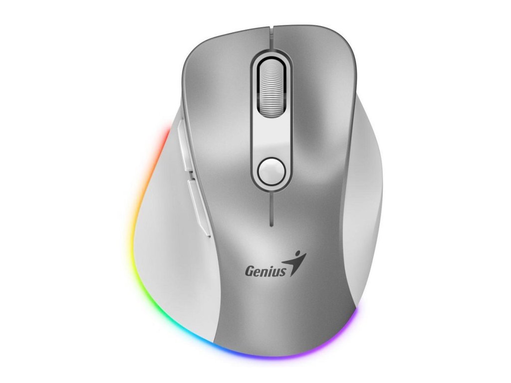 Genius Ergo 9000S Pro dobíjecí bezdrátová Bluetooth mini ergonomická tichá myš * duální režim: Bluetooth a 2,4GHz * připojení až ke třem zařízením * RGB podsvícení - 7 barev Technické parametry Počet tlačítek: 6 Rolovací kolečko: ano DPI: 800/1200 (výchozí)/1600/2400 Senzor: optický Rozhraní: bezdrátový přijímač USB 2,4GHz, Bluetooth 5.0, USB-C pro nabíjení Dosah: 10m Baterie: vestavěná dobíjecí 500mAh Systémové požadavky * 2,4GHz: volný port USB, Windows, macOS, Chrome OS * Bluetooth: Windows, macOS X, Chrome OS, iOS, iPadOS, Android Barva: stříbrná (Silver) Rozměry: 90,7×68,2×39,3mm Hmotnost: 65g Obsah balení: * bezdrátová BT mini ergonomická myš * přijímač USB * nabíjecí kabel USB-A na USB-C * uživatelská dokumentaceDodatočné parametre