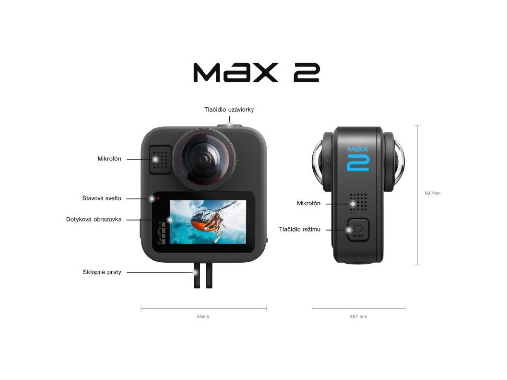 GoPro MAX 2 definuje novú kategóriu 360° kamier vďaka natívnemu 8K sférickému videu. To predstavuje o 21 % vyššie rozlíšenie pre bezkonkurenčnú ostrosť. Technológia reframingu umožňuje dodatočný výber uhla pohľadu z 360° záznamu. Stabilizácia Max HyperSmooth v kombinácii s 360° zámkom horizontu zaisťuje plynulý obraz bez ohľadu na pohyb kamery. Konštrukcia je vodotesná do 5 m a obsahuje vymeniteľné ochranné šošovky z optického skla. Vďaka 10-bitovým farbám a GP-Log enkodovaniu ponúka profesionálne možnosti postprodukcie a farebných úprav.
