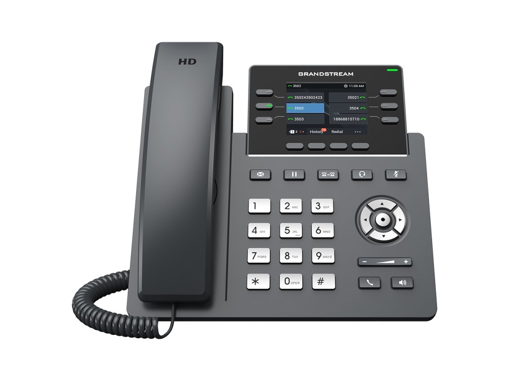 Profesionální 6řadý IP telefon navržený pro hromadné nasazení a snadnou správu. GRP2613(W) obsahuje 24 virtuálních víceúčelových klíčů (VPK), integrovanou Wi-Fi 6 (GRP2613W), duální gigabitové porty, barevný LCD s vyměnitelnými čelními deskami pro snadné přizpůsobení loga a další. Je podporován systémem správy zařízení (GDMS) společnosti Grandstream. Klíčové vlastnosti: Podporuje až 4 SIP účty a 6 víceúčelových linek Vyměnitelné čelní desky umožňují snadné přizpůsobení loga Duální přepínané autosensing 10/100/1000 Mbps gigabitové ethernetové porty s integrovaným PoE Vybaveno technologií noise shield pro minimalizaci hluku na pozadí HD zvuk s podporou všech hlavních kodeků, včetně širokopásmových kodeků G.722 a Opus Až 24 digitálních BLF klíčů Integrovaná dvoupásmová (2,4 GHz a 5 GHz) Wi-Fi 6 (802.11a/b/g/n/ac/ax) a Bluetooth® Ochrana na podnikové úrovni včetně zabezpečeného spouštění, duálních bitových kopií firmwaru a šifrovaného úložiště datDodatočné parametre