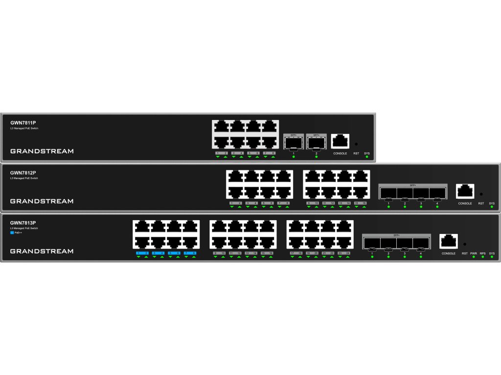 Řada GWN7810 jsou managovatelné L3 switche, které umožňují středním až velkým podnikům budovat škálovatelné, bezpečné, vysoce výkonné a inteligentní podnikové sítě, které jsou plně spravovatelné. Podporují pokročilou VLAN pro flexibilní a sofistikovanou segmentaci provozu, pokročilou QoS pro prioritizaci síťového provozu, IGMP/MLD Snooping pro optimalizaci výkonu sítě a komplexní bezpečnostní funkce proti potenciálním útokům. Modely PoE poskytují inteligentní dynamický PoE výstup pro napájení IP telefonů, IP kamer, Wi-Fi přístupových bodů a dalších koncových bodů PoE. Řadu GWN7810 lze spravovat mnoha způsoby, včetně lokálního webového uživatelského rozhraní přepínače řady GWN7810 a CLI, rozhraní příkazového řádku. Řadu také podporují routery řady GWN, GDMS Networking a GWN Manager, cloudovou a on-premise platformu pro správu sítě od společnosti Grandstream. Řada GWN7810 je nejvýhodnější spravovaná síťová síťová přepínače podnikové úrovně pro střední až velké podniky. Řada GWN7810 zahrnuje modely: GWN7811, GWN7811P, GWN7812P, GWN7813, GWN7813P Klíčové vlastnosti: 8/16/24 gigabitových ethernetových portů a 2/4 10gigabitové SFP+ porty Inteligentní řízení napájení pro podporu dynamického přidělování napájení PoE/PoE+ na port pro modely PoE, porty 1-8 na GWN7813P podporují PoE++ Podporuje nasazení v sítích IPv6 a IPv4 ARP Inspection, IP Source Guard, ochrana DoS, zabezpečení portů a DHCP snooping Vestavěný kontrolér pro správu přepínačů, routerů řady GWN, GDMS Networking a GWN Manageru, cloudové a lokální platformy pro správu sítí Grandstream Vestavěná QoS umožňuje prioritizaci síťového provozu Podporuje stohování pro snadnou správu na jednom rozhraní a zároveň vytváří redundantní zálohy mezi více zařízeními Technické parametry: Ethernetové porty: 24 × RJ45 1Gbps Funkce: L3, QoS, DHCP, CLI Management: Ano PoE: Ano Podpora PoE: 802.3af, 802.3at, 802.3bt Maximální celkový PoE výstupní výkon: 60W (1-8 PoE++) 30W(9-24) Maximální výstupní výkon na PoE port: 30W Přepínací kapacita: 128 Gbps SFP+: 4 Stohování (Stacking): Ano Routing: OSPF, Statický routing, BGP, RIP, Dynamický routing Snooping: IGMP, MLD, MVR RAM (MB): 256 Šasi: Kovové Větrák: Ano VLAN: Ano Montáž: Desktop, Rack, Na zeďDodatočné parametre