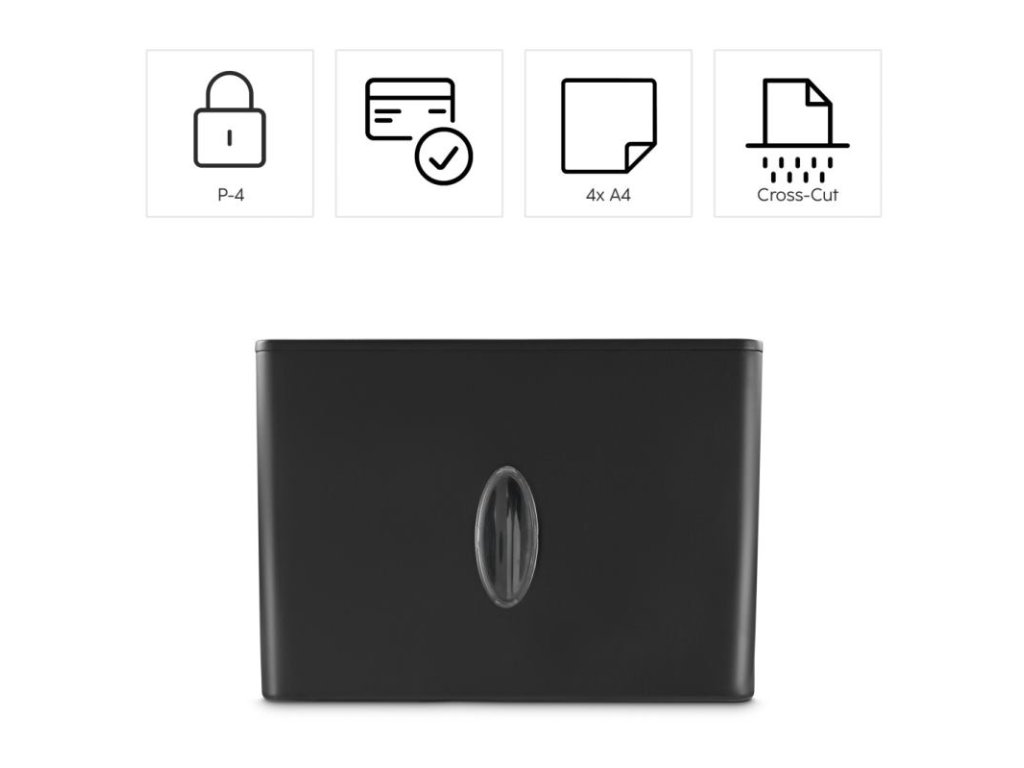 Vysoká úroveň bezpečnosti (P-4): Skartovačka využíva krížový rez, ktorým nareže papier na malé častice s rozmermi len 4 x 33 mm. Tento stupeň bezpečnosti (P-4 podľa normy DIN 66399) je vhodný na likvidáciu dokumentov obsahujúcich osobné a dôverné údaje, ako sú zmluvy, bankové výpisy či zdravotné záznamy.