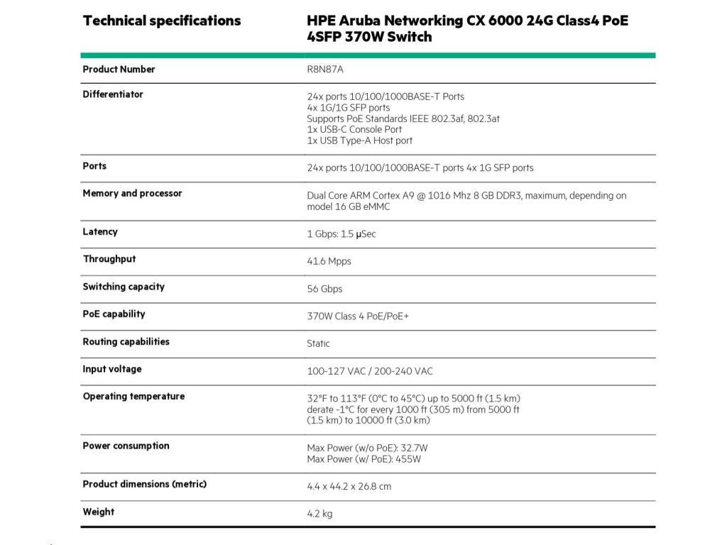 HPE Aruba Networking CX 6000 24G Class4 PoE 4SFP 370W Switch RENEW R8N87A R8N87AR#ABB