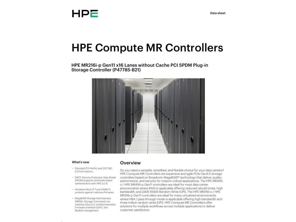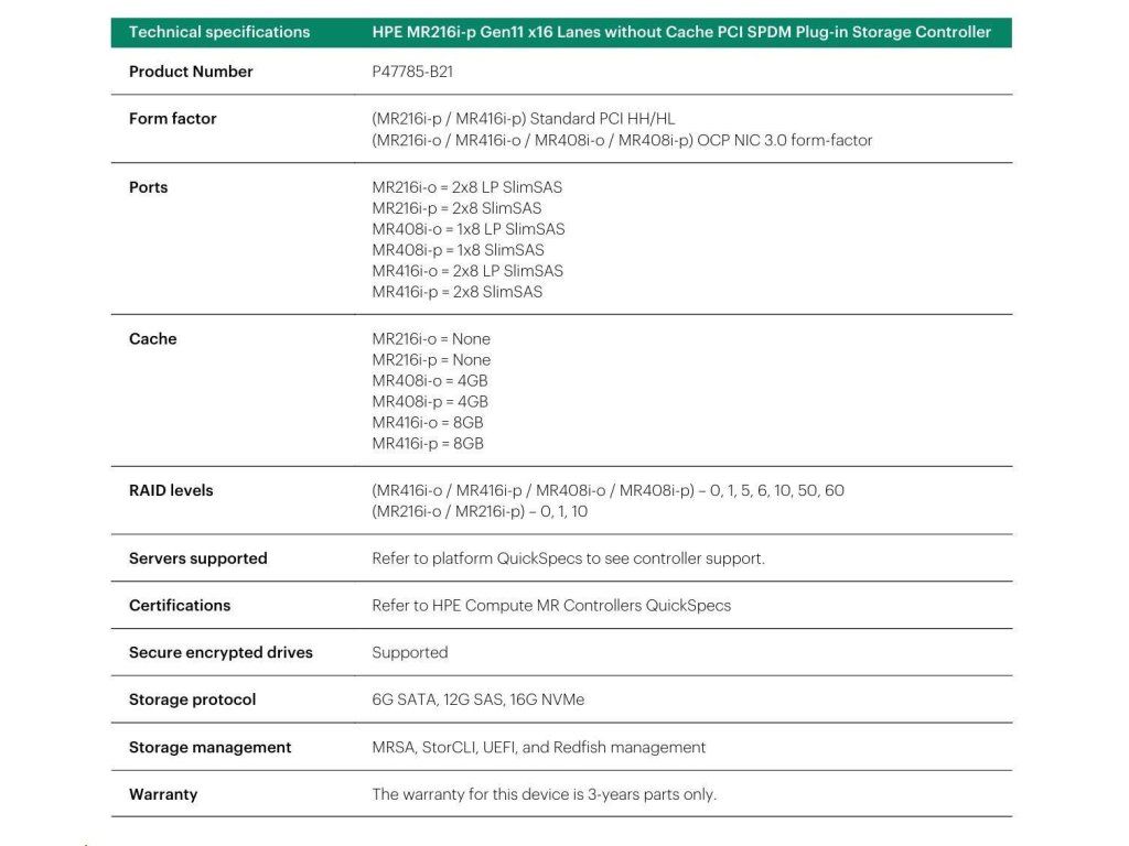 HPE MR216i-p Gen11 16 Internal Lanes/No Cache SPDM PCI Plug-in Storage Controller (raid 0,1,10 only) P47785-B21