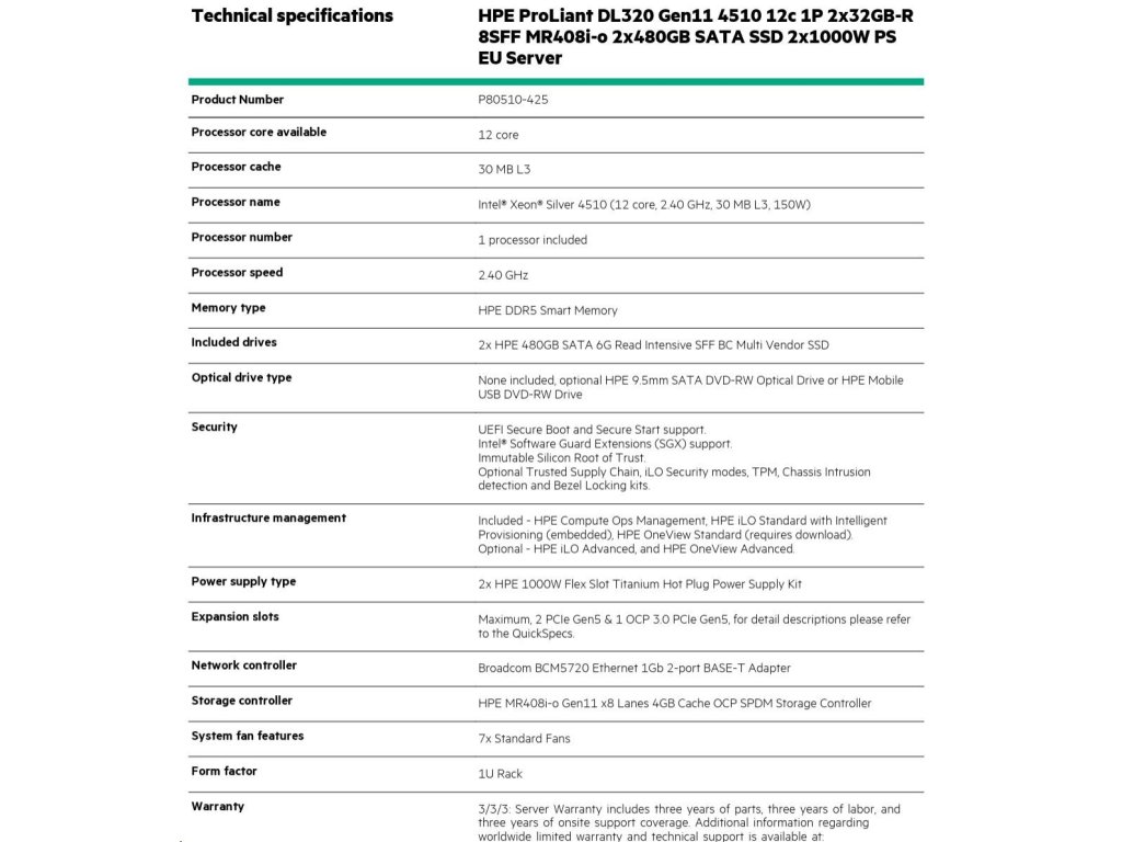 HPE PL DL320g11 4510 (2.4/12C) 2x32G (p64706) 2x480G (P40497) MR408i-o 8SFF 2x1000W 2x1Gb Smart Choice P80510-425