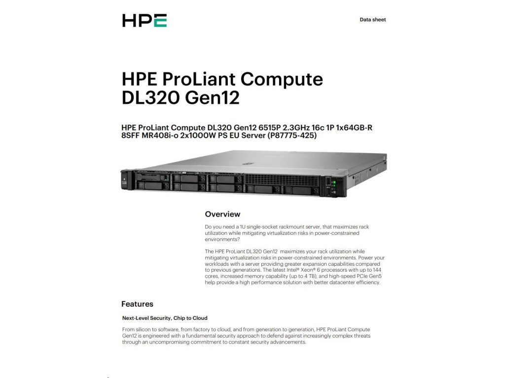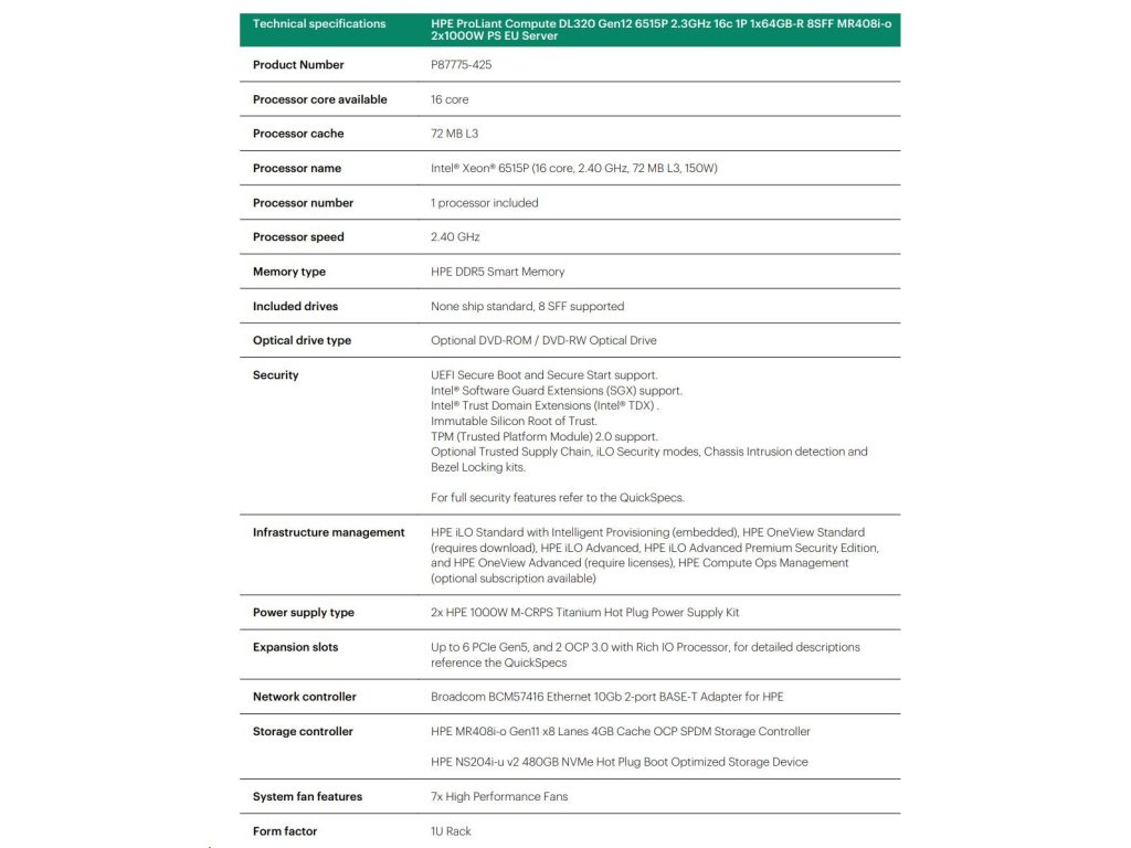 HPE PL DL320g12 6515P (2.4/16C) 1x64G (P69728) MR408i-o 8SFF NS204(2x480G) 2x1000W 10GbE NBD333 Smart Choice P87775-425