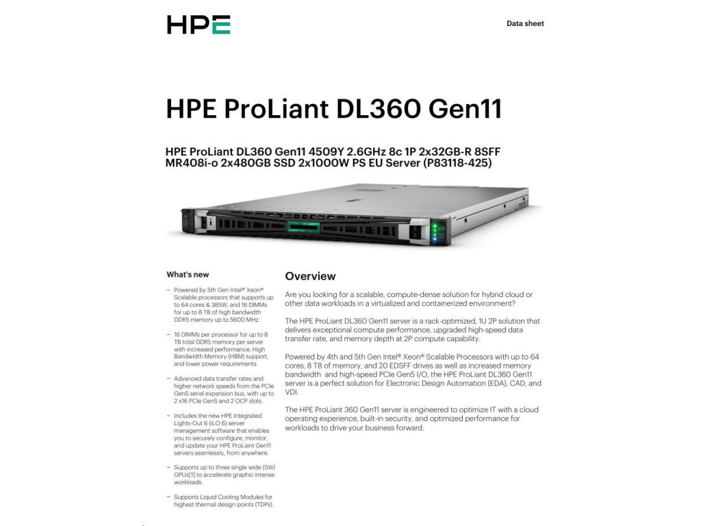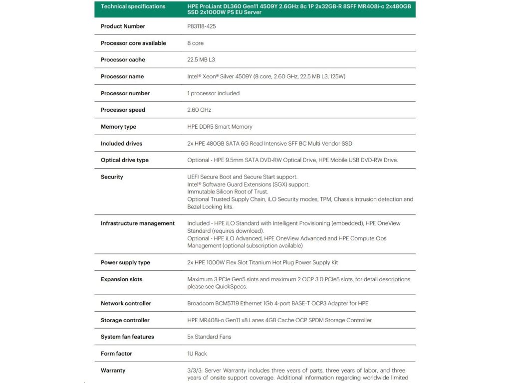 HPE PL DL360g11 4509Y (2.6G/8C) 2x32G (p64706) 2x480G 2x1000W MR408i-o 8SFF 4p1G ocp Smart Choice P83118-425