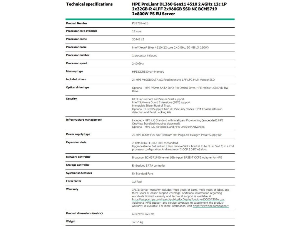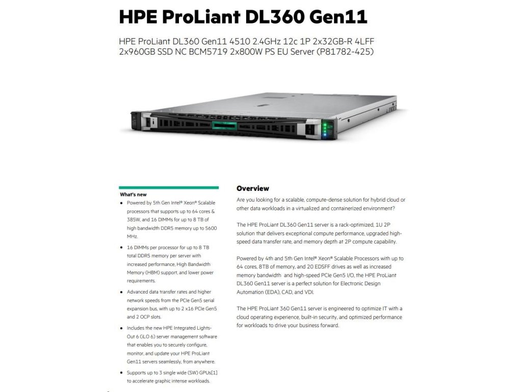 HPE PL DL360g11 4510 (2.4G/12C) 2x32G 2x960G VROC 4LFF LPC 2x800W 4x1G Smart Choice P81782-425