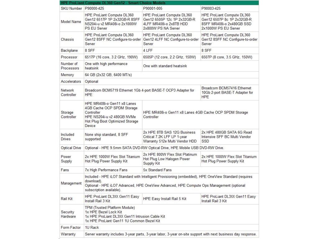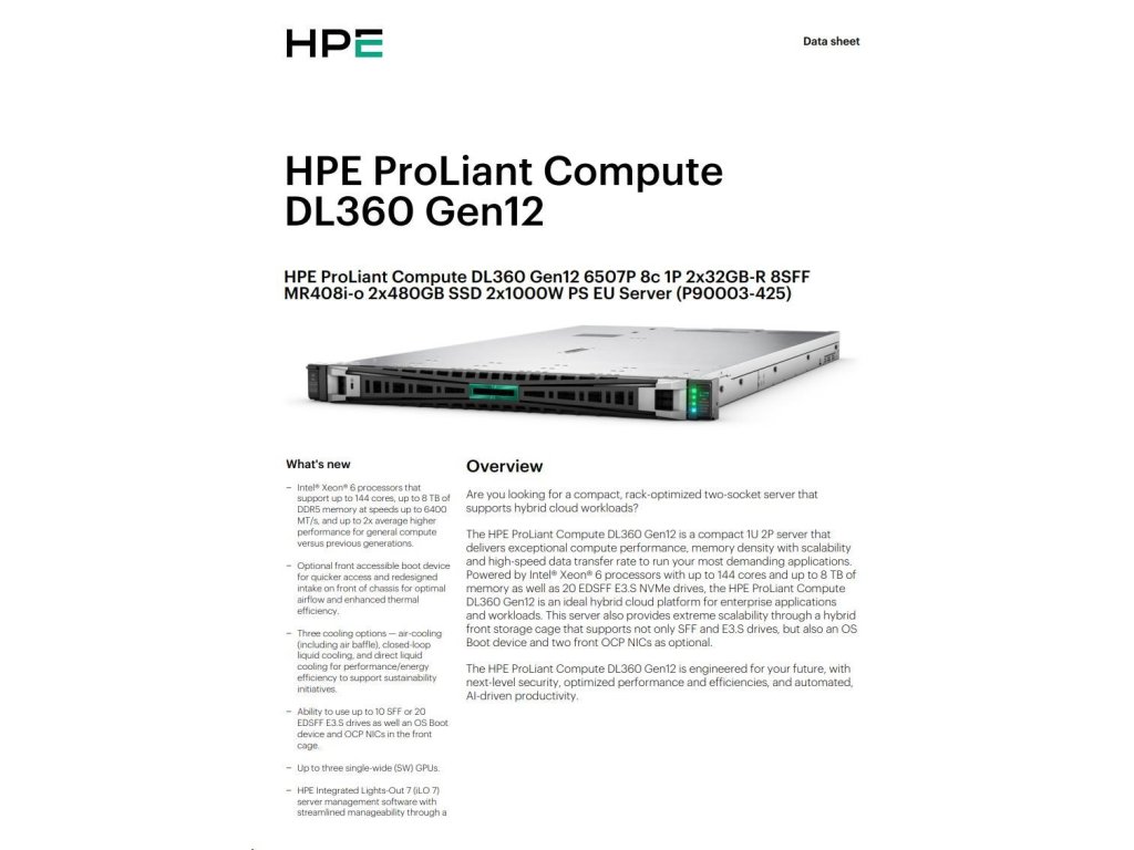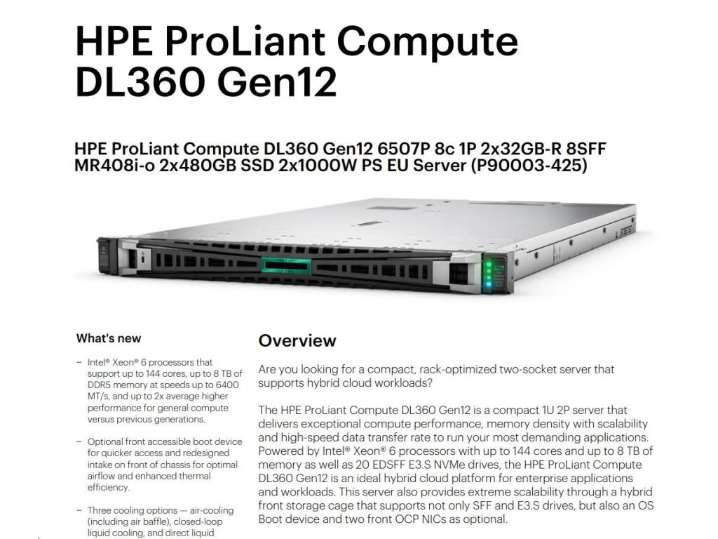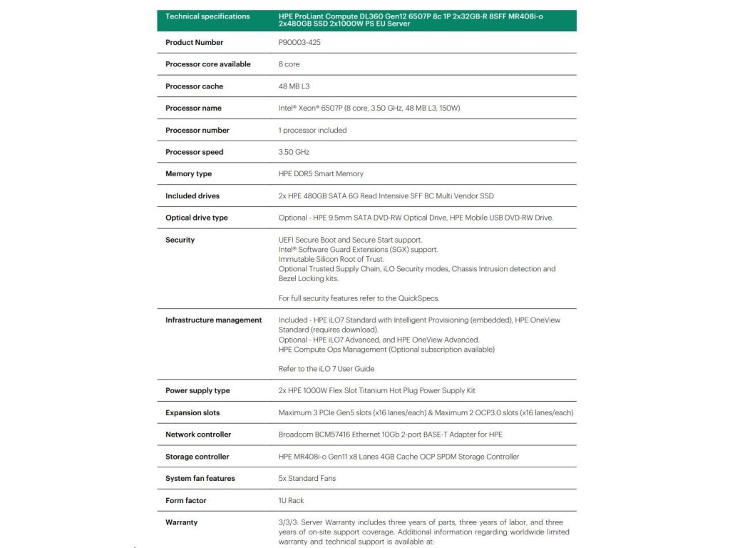 HPE PL DL360g12 6507P (3.5/8C) 2x32G (P69727) 2x480G MR408i-o 8SFF 2x1000W 2p10G-T NBD333 Smart Choice P90003-425