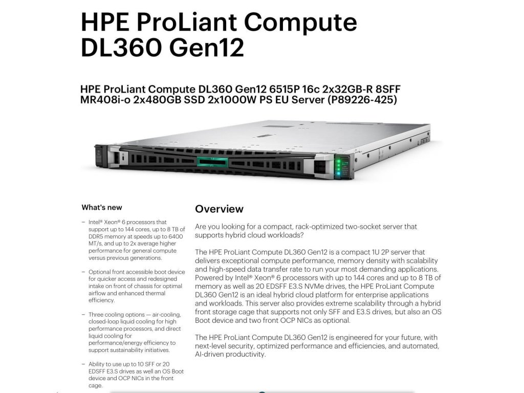 HPE PL DL360g12 6517P (3.2/16C) 2x32G (P69727) NS204 (2x480) MR408i-o 8SFF 2x1000W 4p1G NBD333 Smart Choice P90000-425