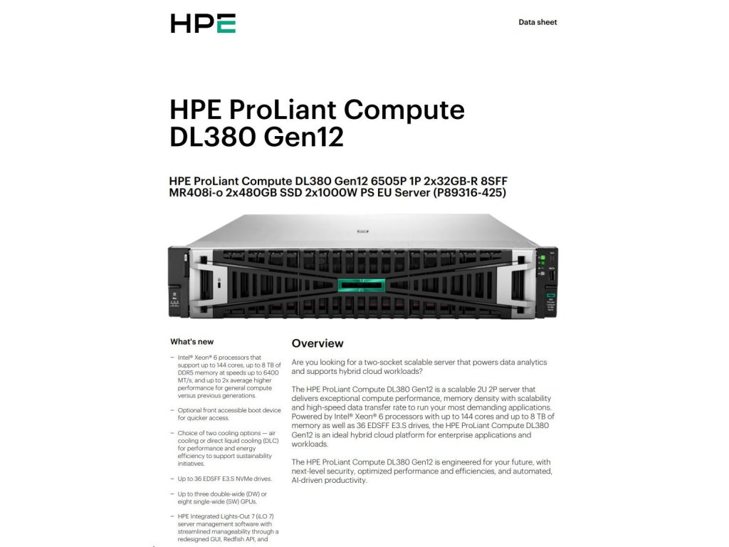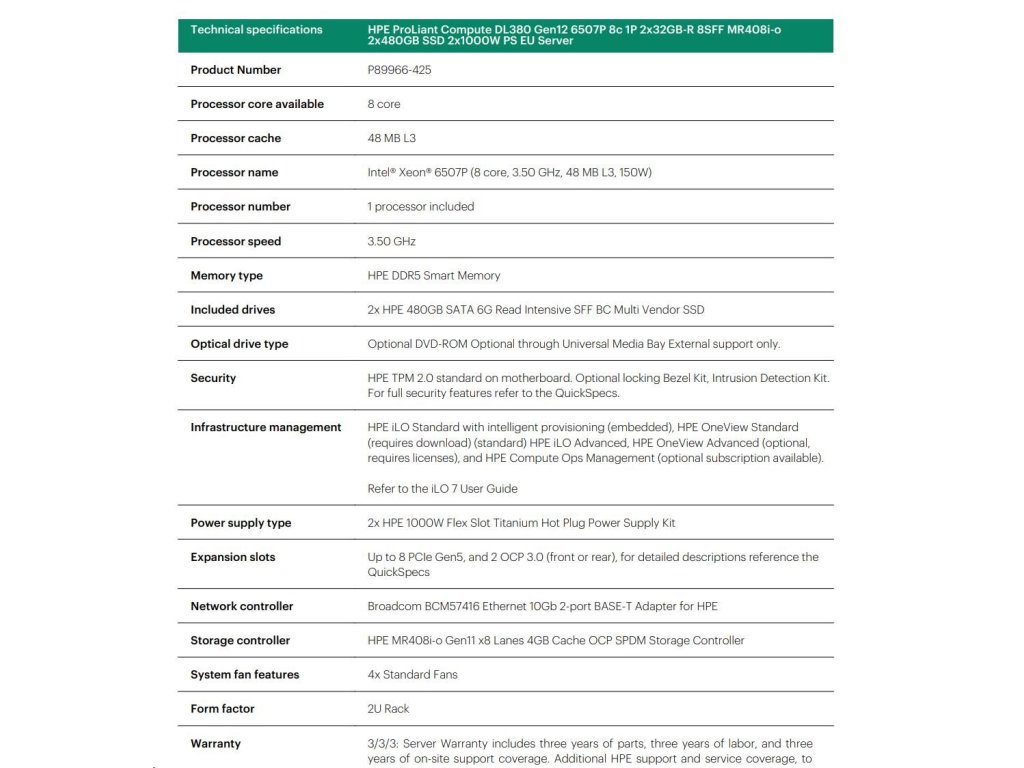 HPE PL DL380g12 6507P (3.5/8C) 2x32G (P69727) 2x480G MR408i-o 8SFF 2x1000W 10GbE NBD333 Smart Choice P89966-425
