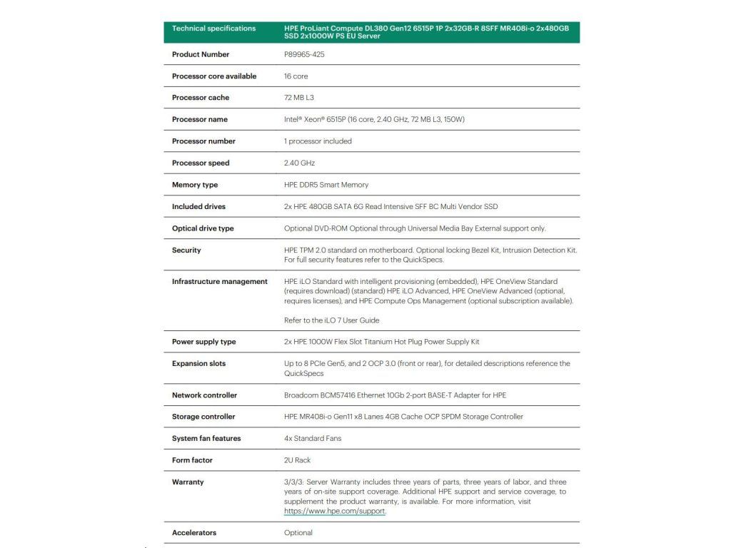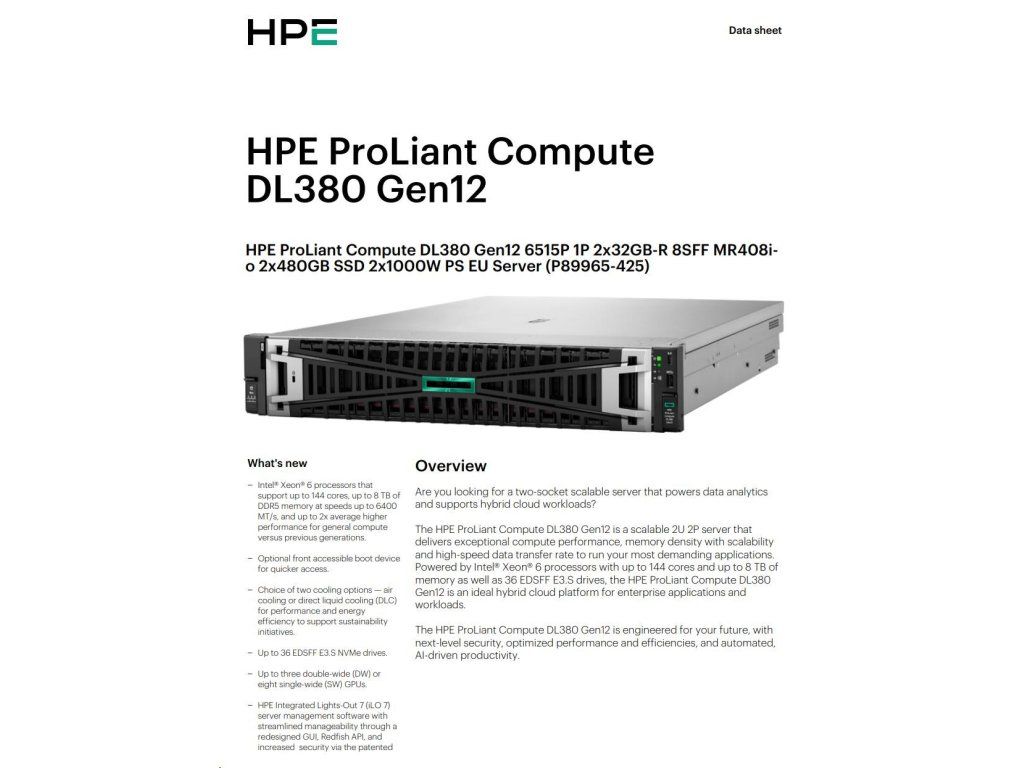 HPE PL DL380g12 6515P (2.4/16C) 2x32G (P69727) 2x480G MR408i-o 8SFF 2x1000W 2p10G-T NBD333 Smart Choice P89965-425