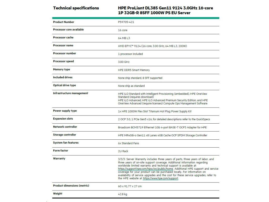 HPE PL DL385g11 AMD Epyc 9124 (3.0G/16C) 1x32G (P50310) MR408i-o/4G 8SFF 1x1000W 4x1Gocp P59705 RENEW P59705R-421