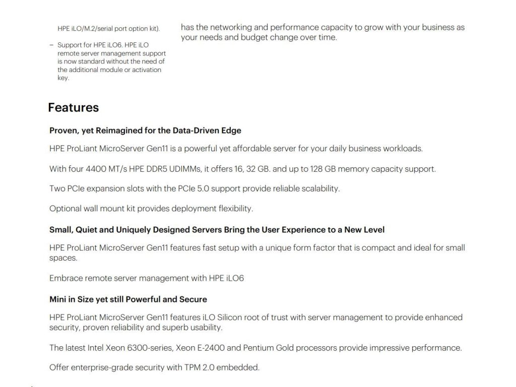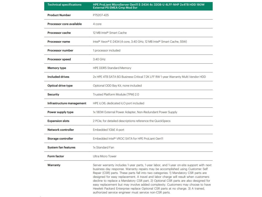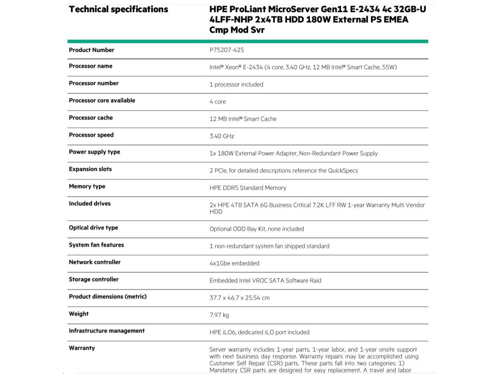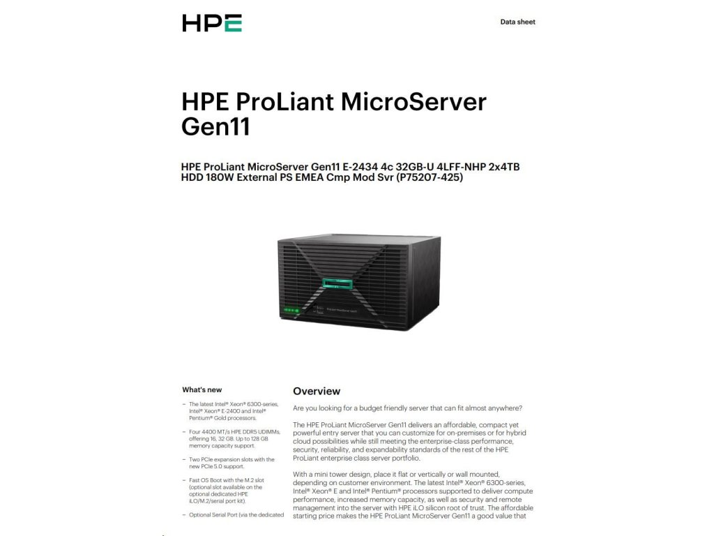 HPE PL MicroServer Gen11 E-2434 (3.4-5G/4C8T) 1x32G 2x4TB SATA 4LFF/SFF-NHP 4p1G iLoPort (P65741) NBD111 Smart Choice P75207-425