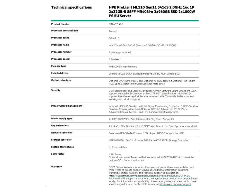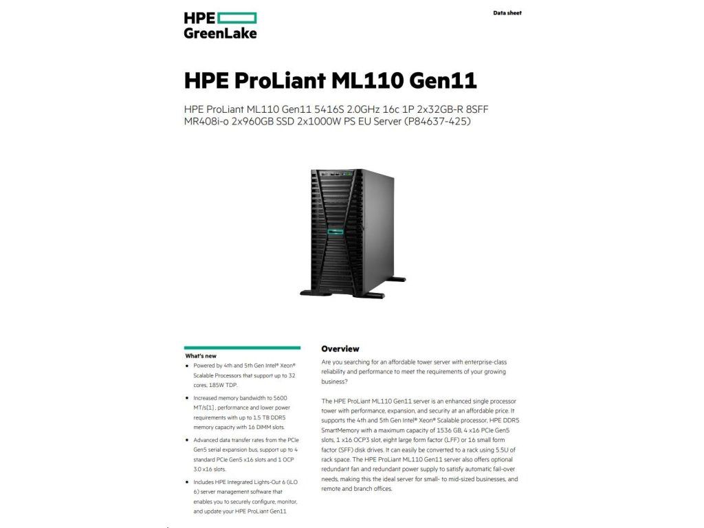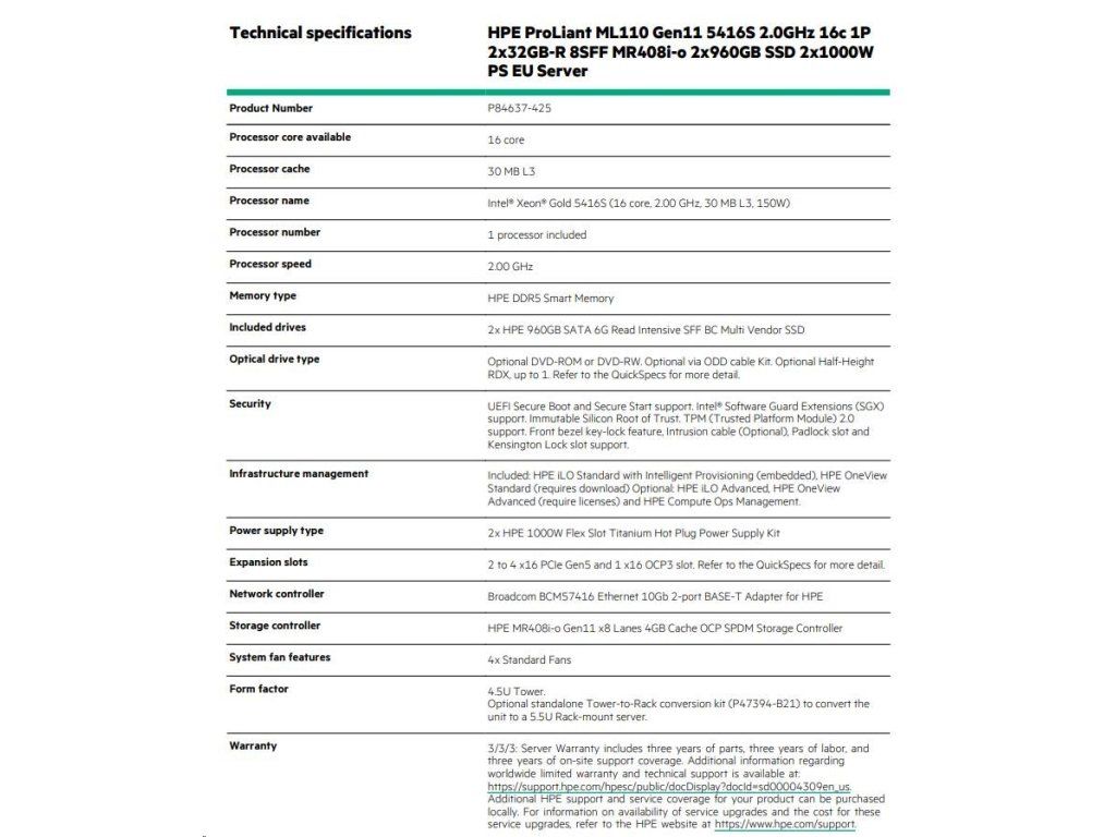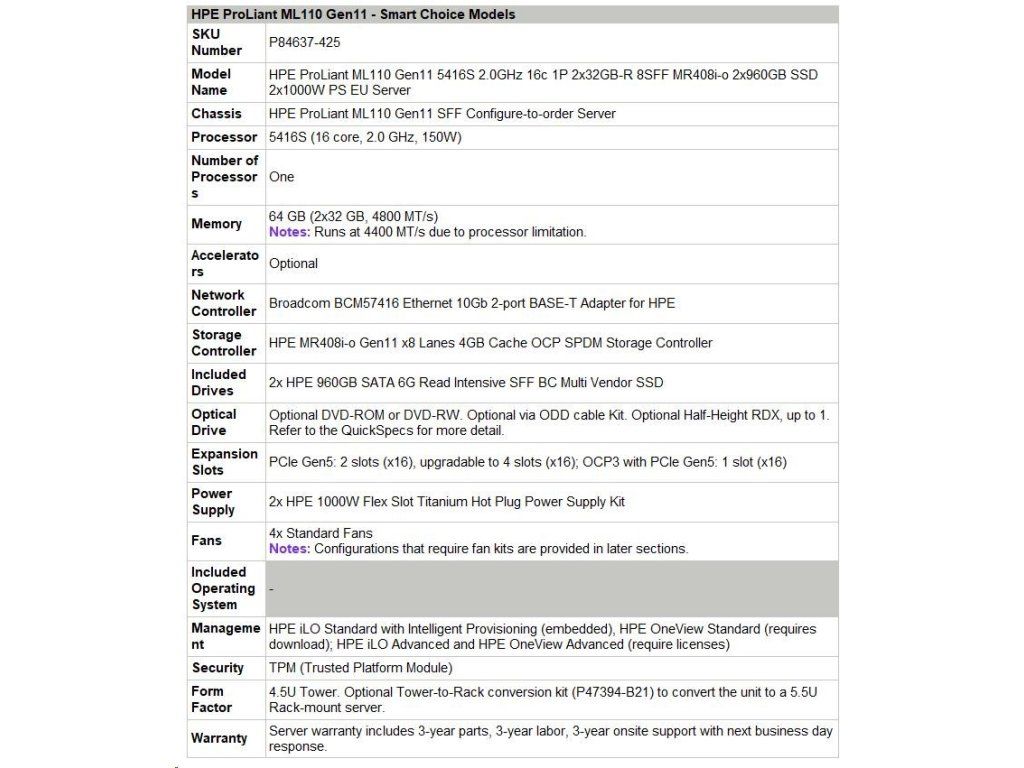 HPE PL ML110g11 5416S (2.0G/16C) 2x32G (p43328) 2x960G (p40498) 2x1000W MR408i-o 8SFF 2p10GT Smart Choice P84637-425