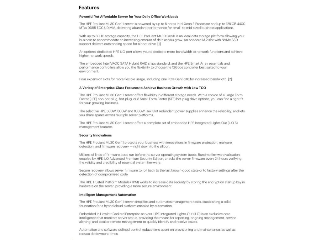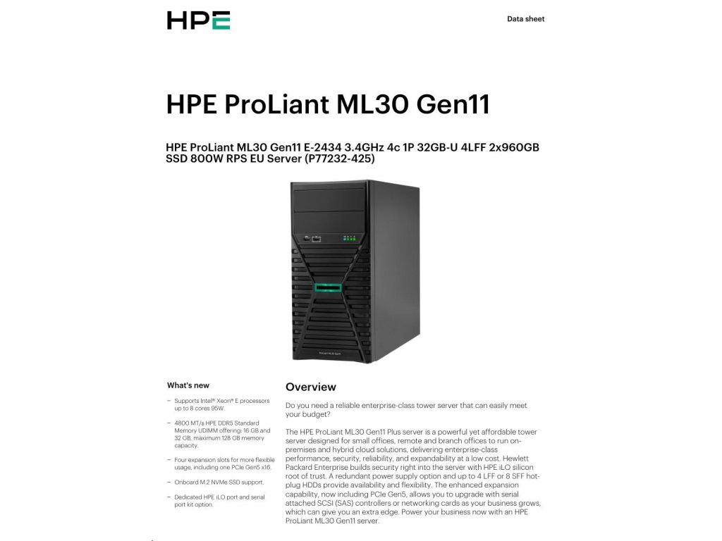 HPE PL ML30g11 E-2434 (3.4G/4C8T) 1x32G (P64339) 2x960G (P47808) 4LFF-HP VROC 800W 4x1G NBD311 Smart Choice P77232-425