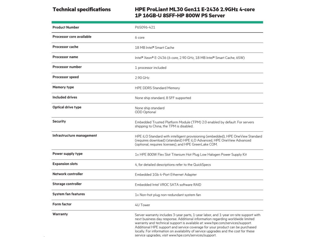 HPE PL ML30g11 E-2436 (2.9-5.0G/6C12T) 1x32G 2x480G 2x800W MR216i-p 8SFF 4x1G NBD311 Smart Choice P81773-425