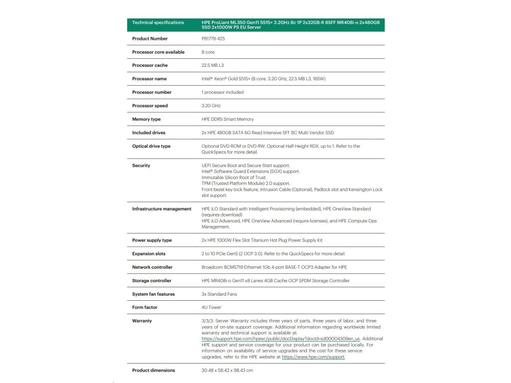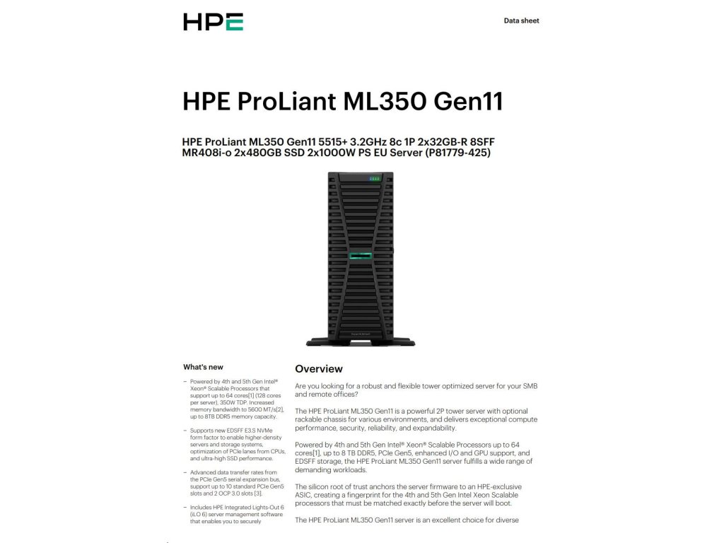 HPE PL ML350g11 5515+ (3.2G/8C) 2x32G (P64706) 2x480G SSD MR408i-o/4G 2x1000W 8-24SFF 4p1G Smart Choice P81779-425