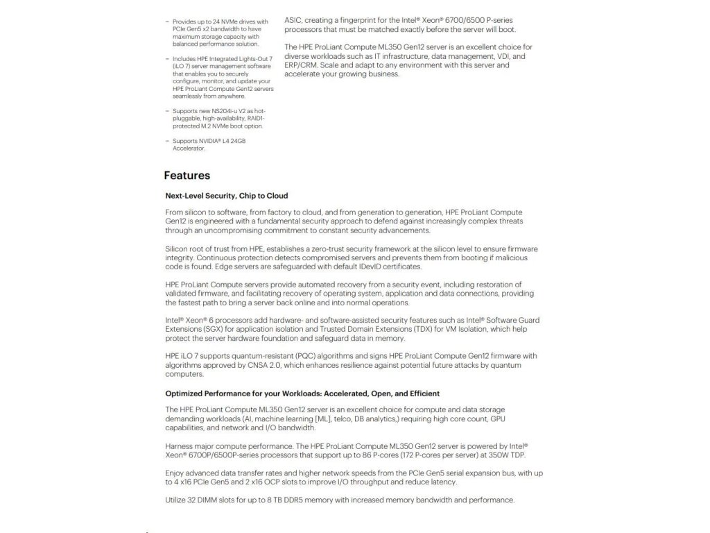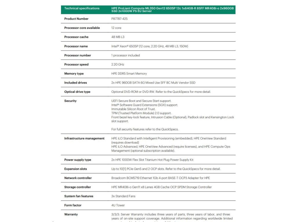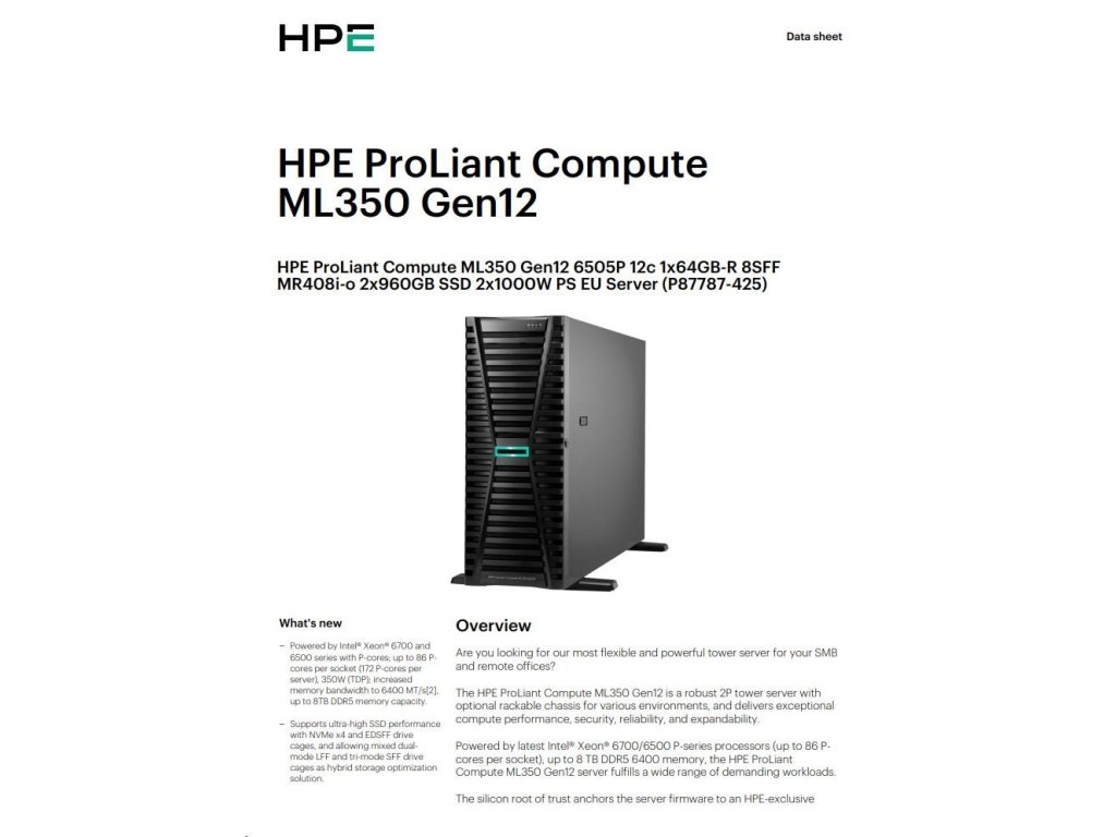 HPE PL ML350g12 6505P (2.2/12C) 1x64G (P69728) 2x960G MR408i-o 8SFF 2x1000W 1GbE NBD333 Smart Choice P87787-425