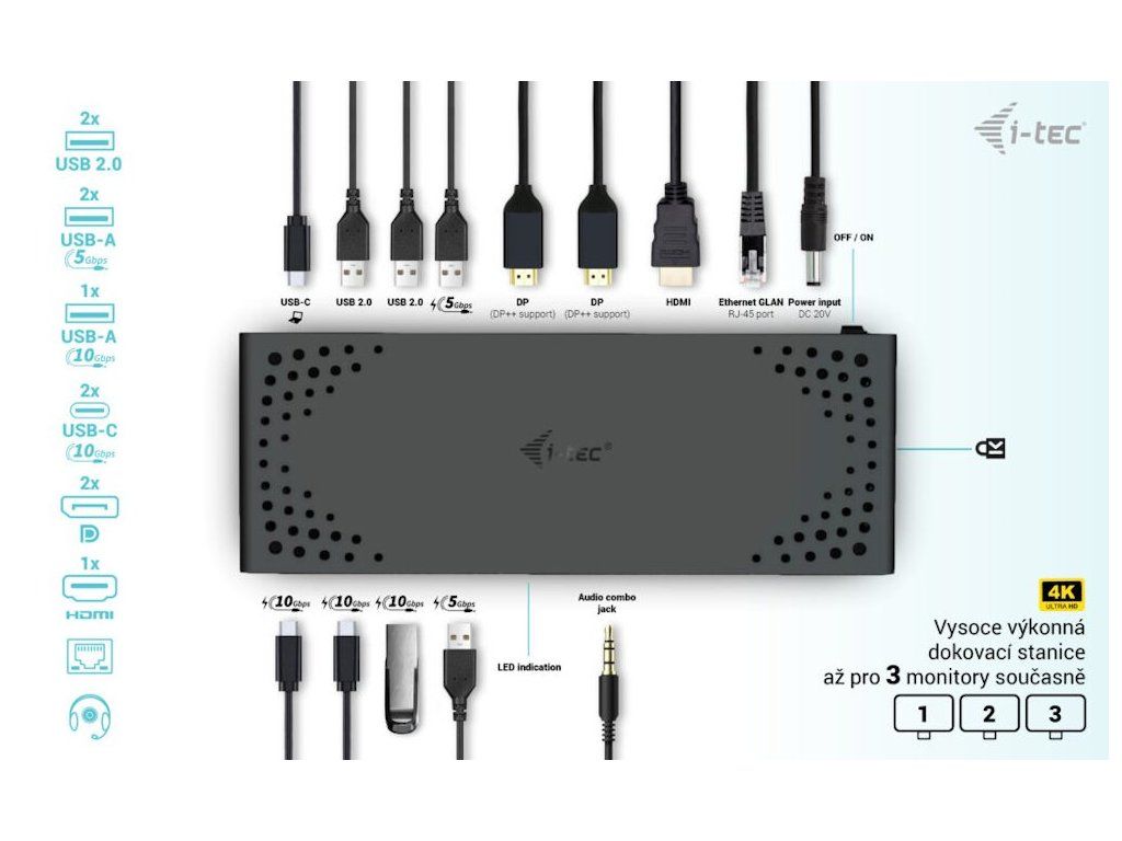 Dokovací stanice i-tec USB-C Triple Display, která je kompatibilní s moderními notebooky, tablety a další výpočetní technikou. Disponuje bohatou nabídkou konektorů, abyste se při využívání periferních zařízení nemuseli omezovat. Mezi přednosti patří například podporuje až 100W napájení připojeného notebooku nebo tabletu, podpora vysokého rozlišení 4K při obnovovací frekvenci až 60 Hz nebo kombinovaný 3,5mm audio/mikroport pro rychlé připojení sluchátek, respektive headsetu.