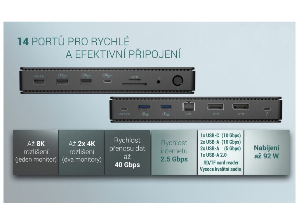 Křišťálově čistá kvalita obrazu, super-rychlý internet a schopnost přenášet data rychlostí až 40 Gb/s díky portům Thunderbolt 4. Dokovací stanice má dále USB-C 3.2 Gen2 (10 Gbps), 2× USB 3.2 Gen2 (10 Gbps), 2× USB 3.0 (5 Gbps) a 1× USB 2.0 port. Taktéž můžete samozřejmě připojit vaše sluchátka či reproduktor a nabíjet váš notebook (92 W), to vše za pomoci jednoho jediného kabelu. Disponuje čtečkou SD a microSD karet. Potěší také 2.5G LAN Ethernet, který zaručí rychlé internetové připojení. Díky integrovanému protokolu DP 1.4 můžete tuto dokovací stanici připojit k monitoru s rozlišením až 8K (7680 × 4320) s obnovovací frekvencí 30 Hz, což odpovídá rozlišení čtyř 4K monitorů. To z něj činí ideální řešení pro grafiky, analytiky, vývojáře, filmové střihače nebo nadšence a milovníky videa ve vysokém rozlišení. Samozřejmostí je vypínač či slot pro bezpečnostní zámek.