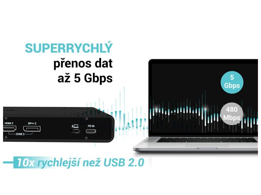 Dokovací stanice umožňuje připojit notebook, tablet nebo smartphone k dalším monitorům a hardwaru. K počítači či notebooku se připojuje pomocí USB-C portu s podporou Thunderbolt 3/4 a USB4. Na podporovaných zařízeních je tak schopná přenášet i napájení až 85 W. K dokovací stanici je možné připojit dva 4K monitory při 60 Hz. Vysokorychlostní přístup k internetu lze realizovat skrze přítomný RJ-45 port. Pro připojení periférií jsou přítomny dva USB-C, dva USB 2.0 a dva USB 3.0 porty. Dokovací stanici lze nainstalovat i dozadu za monitor s podporou VESA uchycení díky VESA držáku (není součástí), čímž získáte jak maximální pracovní efektivitu díky rozšiřitelnosti portů, tak i krásně uklizený stůl bez kabelů. Potěší také slot pro bezpečnostní zámek a vypínač dokovací stanice pro maximální úsporu elektrické energie.