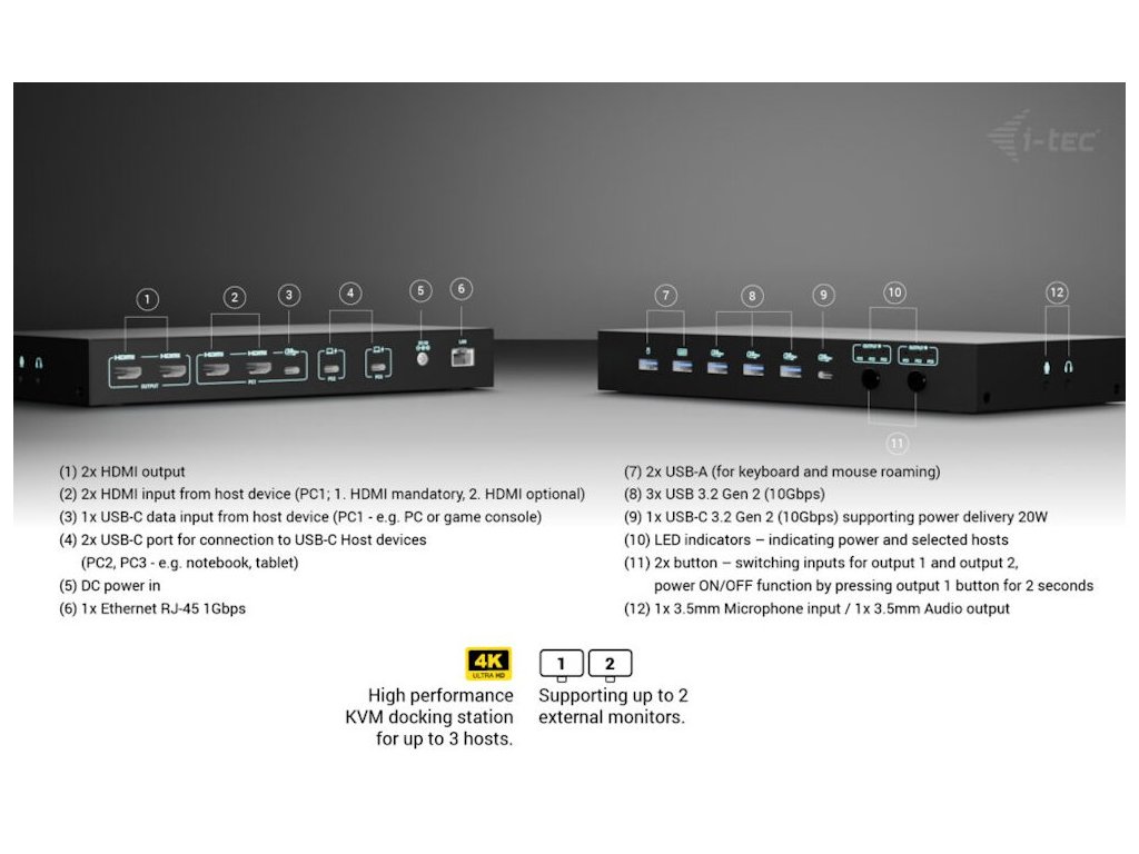 Dokovací stanice i-tec dokovací stanice USB-C s KVM přepínačem naváže konektivitu s nepřebernou řadou periferních zařízení a vytvoří kolem vás špičkové výpočetní centrum. Podpoří profesionální multitasking a efektivní činnost s více zařízeními najednou. Tento dok pojme vše, co potřebujete pro náročnou práci i multimediální zábavu. Kromě toho je dokovací stanice i-tec USB-C praktickým KVM přepínačem, který vám umožní doslova kouzlit a sdílet periferie mezi jednotlivými zařízeními.