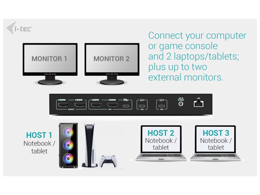 Dokovací stanice i-tec USB-C umožňuje připojení až 3 hostitelských zařízení současně (notebook, tablet nebo herní konzoli / PC). Samozřejmostí je podpora dvou externích monitorů s rozlišením až 4K, takže můžete využít dva různé zdroje obrazu, nebo rozšířit pracovní plochu. Nechybí ani porty USB nebo gigabitový Ethernet pro stabilní připojení k síti. Pro sluchátka a mikrofon jsou k dispozici samostatné audio porty.