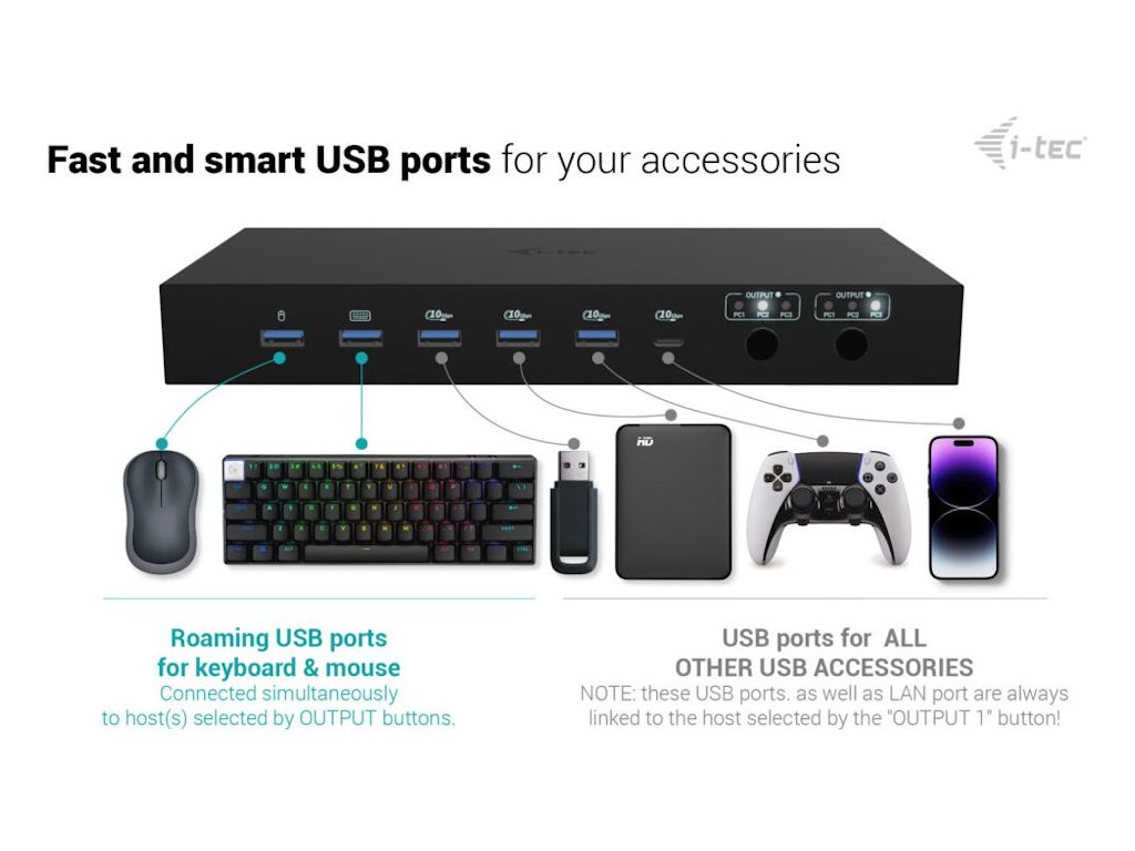 Chytré USB porty s funkcí roaming umožní sdílet myš a klávesnici, aniž byste se zapletli ve změti kabelů při přepojování. Stačí klik a je to. Pracovní notebook nebo herní konzole? Vše najednou. Přítomné vstupy vám umožní připojit rozmanitá zařízení, ať už se jedná o práci, nebo zábavu. Takže zatímco dokončujete firemní projekt, na jiném vstupu už se stahuje zábava na večer.