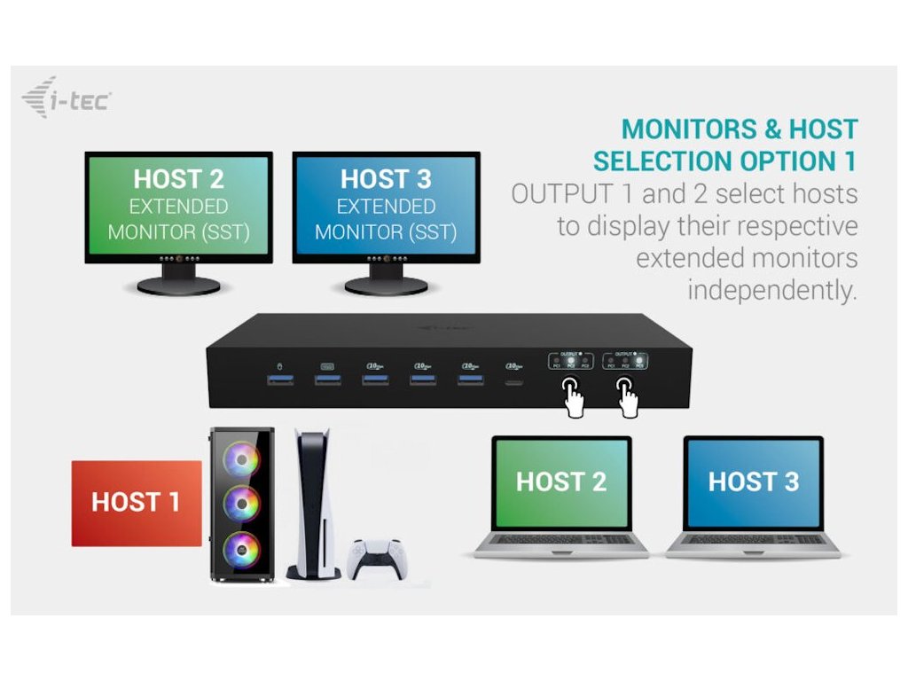 - Připojte až 3 hostitelská zařízení současně (2× notebook/tablet + 1× herní konzole/PC)
